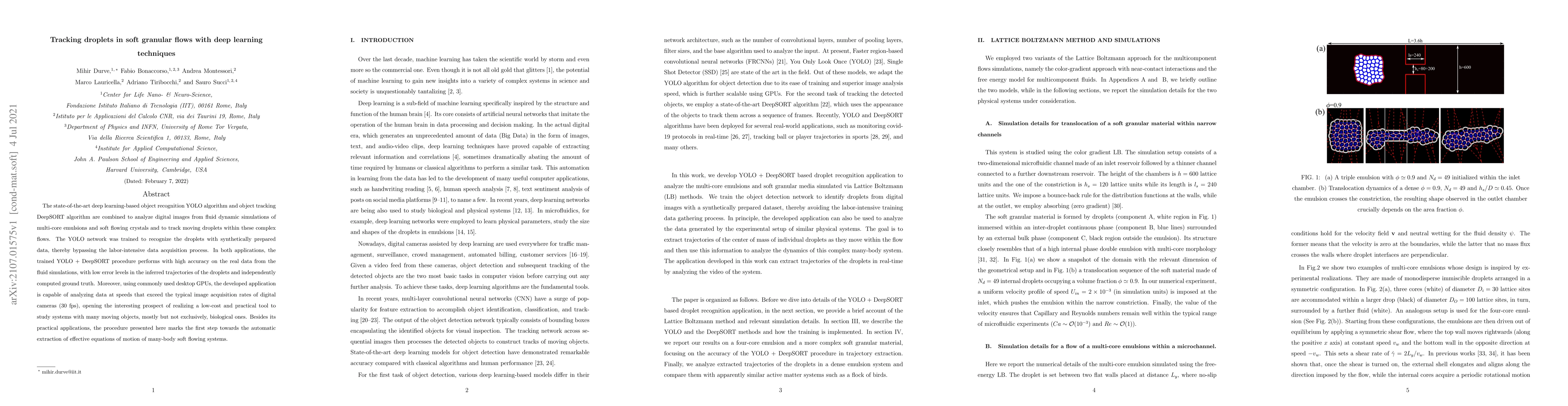 The state-of-the-art deep learning-based object recognition YOLO algorithm and object tracking DeepSORT algorithm are combined to analyze digital images from fluid dynamic simulations of multi-core emulsions and soft flowing crystals and to track moving droplets within these complex flows. The YOLO network was trained to recognize the droplets with synthetically prepared data, thereby bypassing the labor-intensive data acquisition process. In both applications, the trained YOLO + DeepSORT procedure performs with high accuracy on the real data from the fluid simulations, with low error levels in the inferred trajectories of the droplets and independently computed ground truth. Moreover, using commonly used desktop GPUs, the developed application is capable of analyzing data at speeds that exceed the typical image acquisition rates of digital cameras (30 fps), opening the interesting prospect of realizing a low-cost and practical tool to study systems with many moving objects, mostly but not exclusively, biological ones. Besides its practical applications, the procedure presented here marks the first step towards the automatic extraction of effective equations of motion of many-body soft flowing systems.