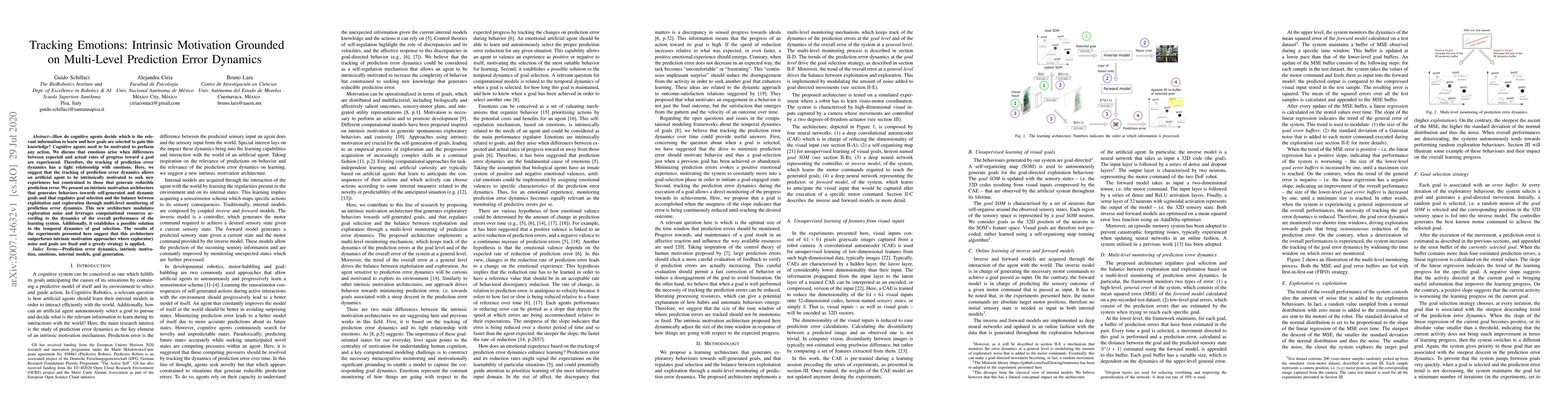 How do cognitive agents decide what is the relevant information to learn and how goals are selected to gain this knowledge? Cognitive agents need to be motivated to perform any action. We discuss that emotions arise when differences between expected and actual rates of progress towards a goal are experienced. Therefore, the tracking of prediction error dynamics has a tight relationship with emotions. Here, we suggest that the tracking of prediction error dynamics allows an artificial agent to be intrinsically motivated to seek new experiences but constrained to those that generate reducible prediction error.We present an intrinsic motivation architecture that generates behaviors towards self-generated and dynamic goals and that regulates goal selection and the balance between exploitation and exploration through multi-level monitoring of prediction error dynamics. This new architecture modulates exploration noise and leverages computational resources according to the dynamics of the overall performance of the learning system. Additionally, it establishes a possible solution to the temporal dynamics of goal selection. The results of the experiments presented here suggest that this architecture outperforms intrinsic motivation approaches where exploratory noise and goals are fixed and a greedy strategy is applied.