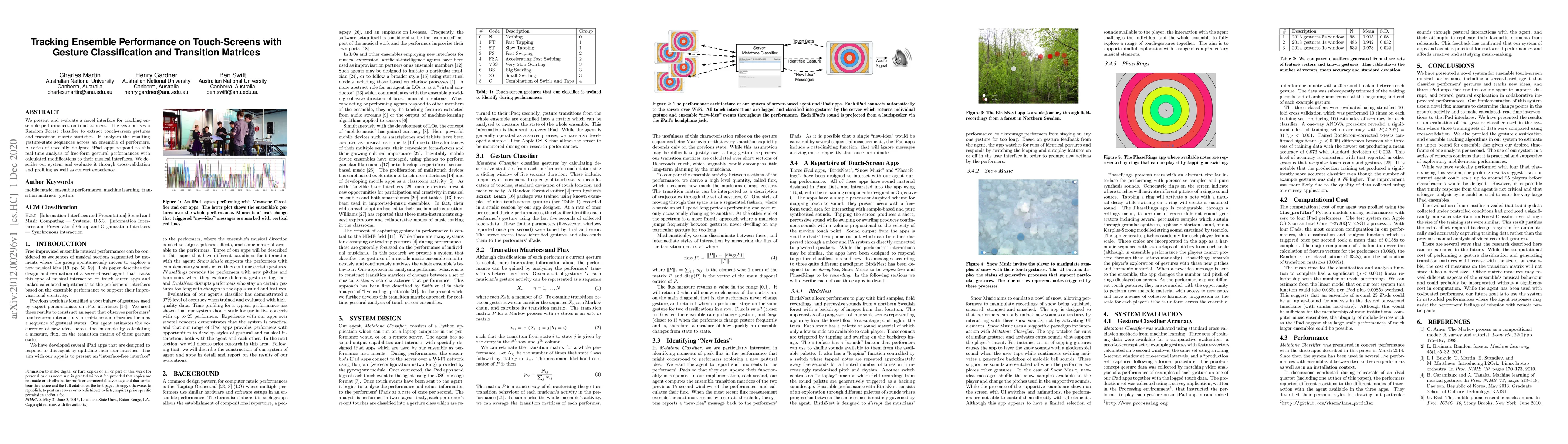 This research paper introduces a novel interface that tracks ensemble performances on touch-screens using gesture classification and transition matrices, enabling real-time modifications to musical interfaces.