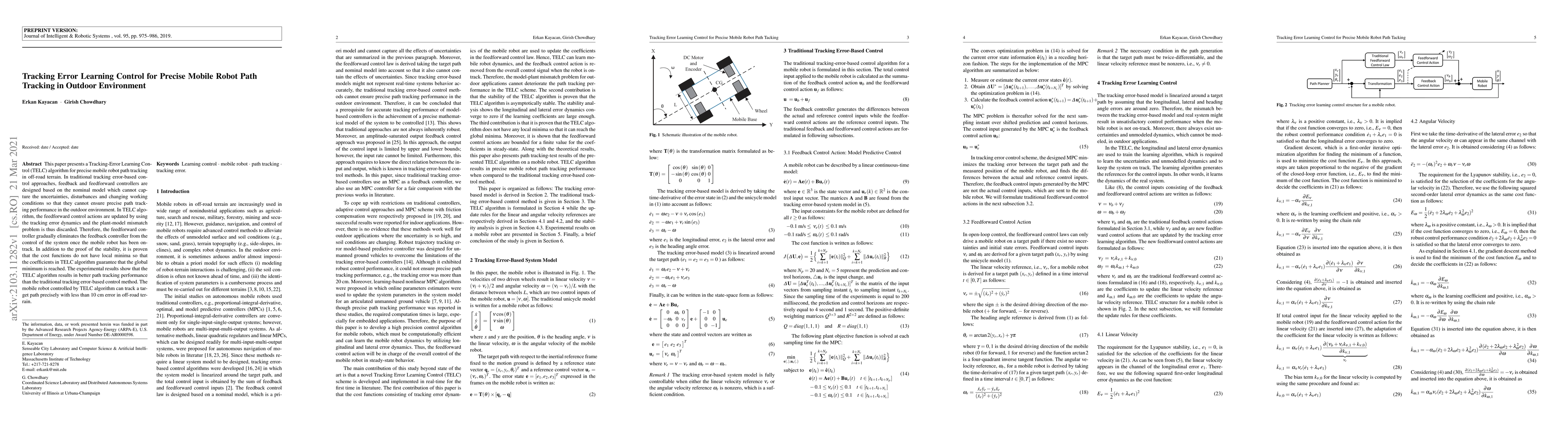 This paper introduces a Tracking-Error Learning Control (TELC) algorithm for precise mobile robot path tracking in outdoor environments, demonstrating superior performance over traditional methods by eliminating plant-model mismatches and achieving less than $10$ cm error in off-road terrain. The TELC algorithm ensures global minimum cost functions and stability.