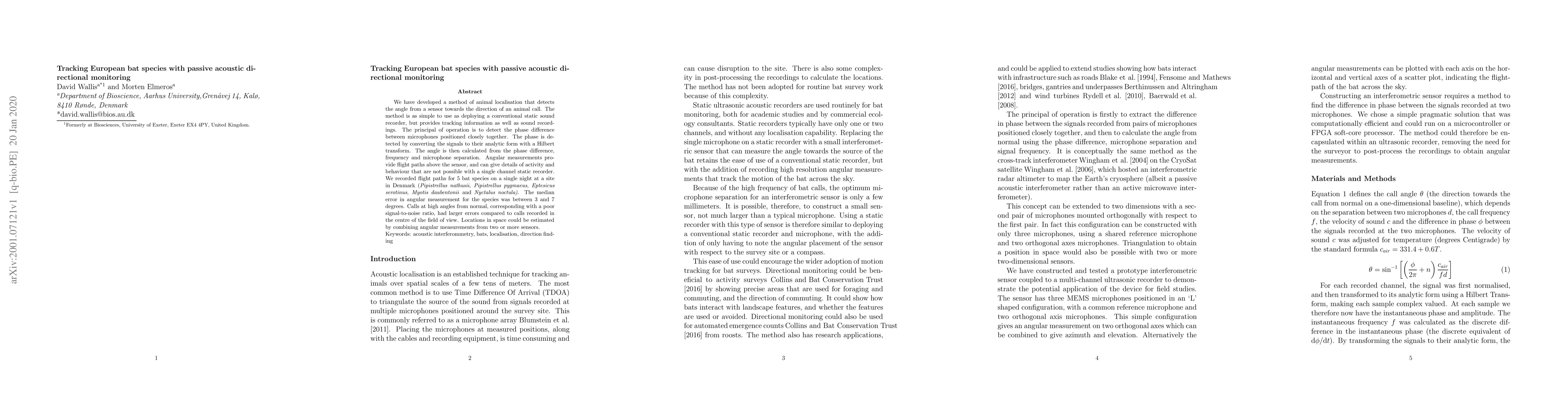 This paper presents a new method using passive acoustic directional monitoring to track European bat species by measuring the angle of their calls. The technique, utilizing the phase difference between close microphones and Hilbert transform, provides detailed flight paths and behavior insights. Tested on five bat species in Denmark, it showed median angular measurement errors between 3 and 7 degrees, with higher errors for weak signals. Combining data from multiple sensors enables spatial location estimation.