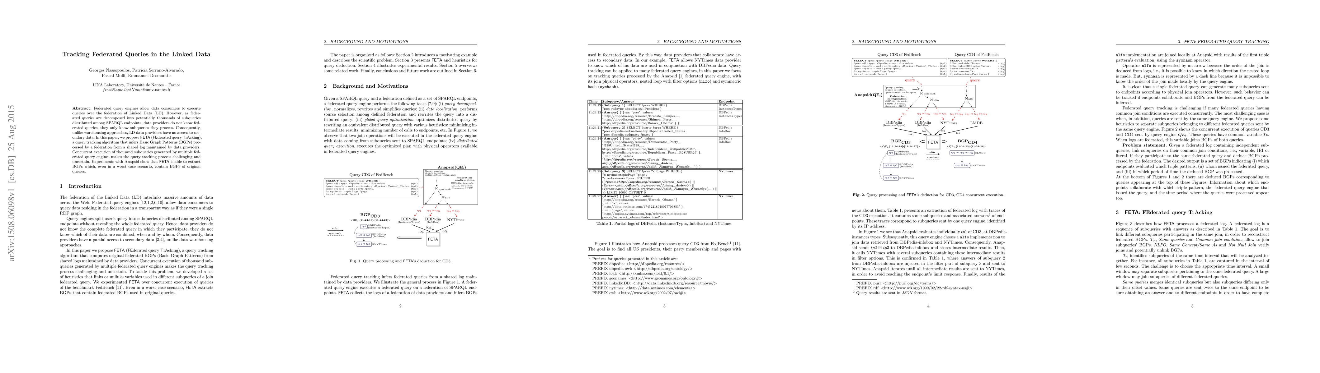 Title: Tracking Federated Queries in the Linked Data Summary: FETA is a proposed algorithm for tracking federated queries in Linked Data by inferring Basic Graph Patterns from shared logs, addressing the challenge of concurrent execution of numerous subqueries across SPARQL endpoints. Experiments demonstrate FETA's effectiveness in extracting relevant BGPs even in complex scenarios.