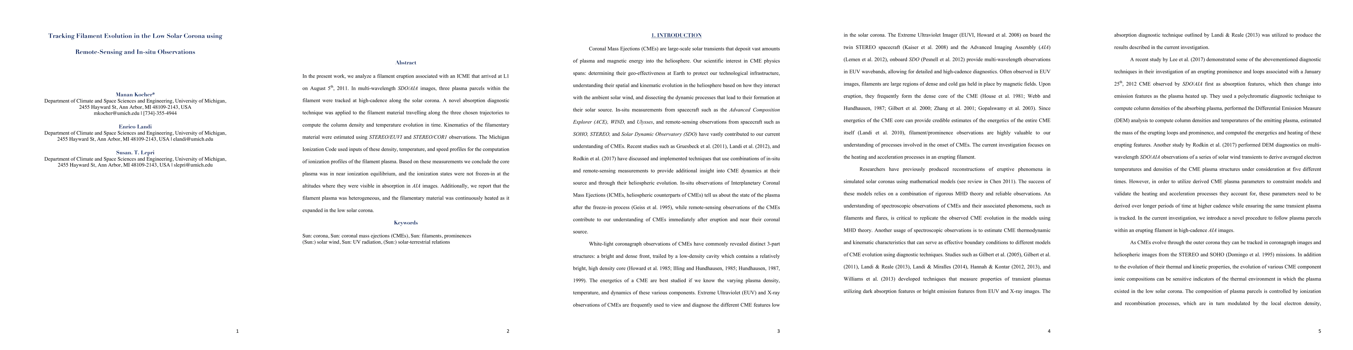 This study tracks the evolution of a filament eruption in the low solar corona using remote-sensing and in-situ observations, revealing that the filament plasma was heterogeneous and continuously heated as it expanded, with ionization states not frozen-in at the observed altitudes.