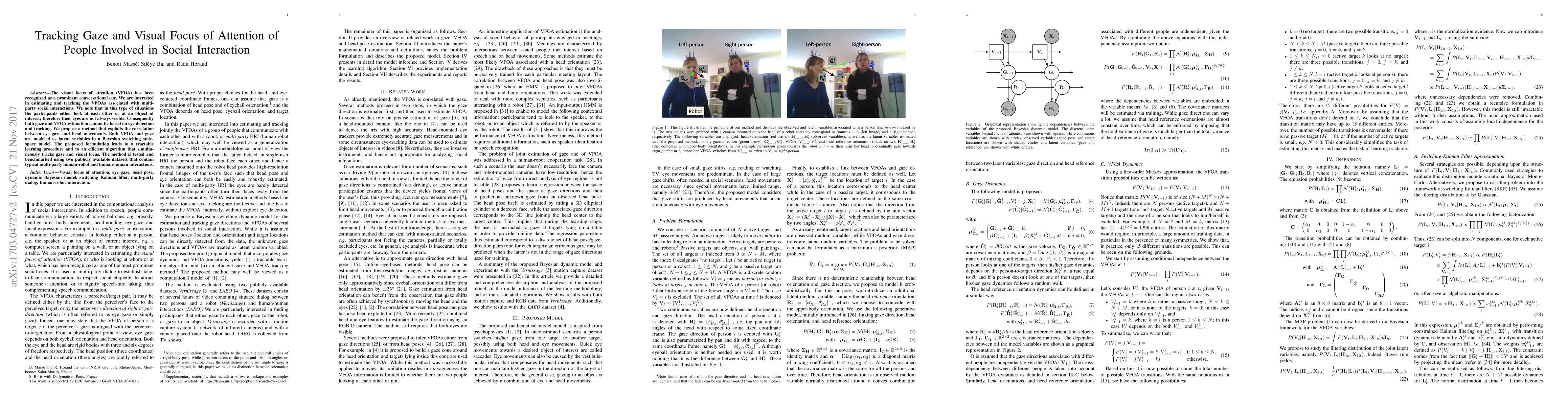 This paper proposes a method to estimate and track the visual focus of attention (VFOA) in multi-party social interactions using a Bayesian switching state-space model that correlates eye gaze and head movements, as direct eye detection is not always feasible. The method is validated using datasets of human-robot and human-human interactions.