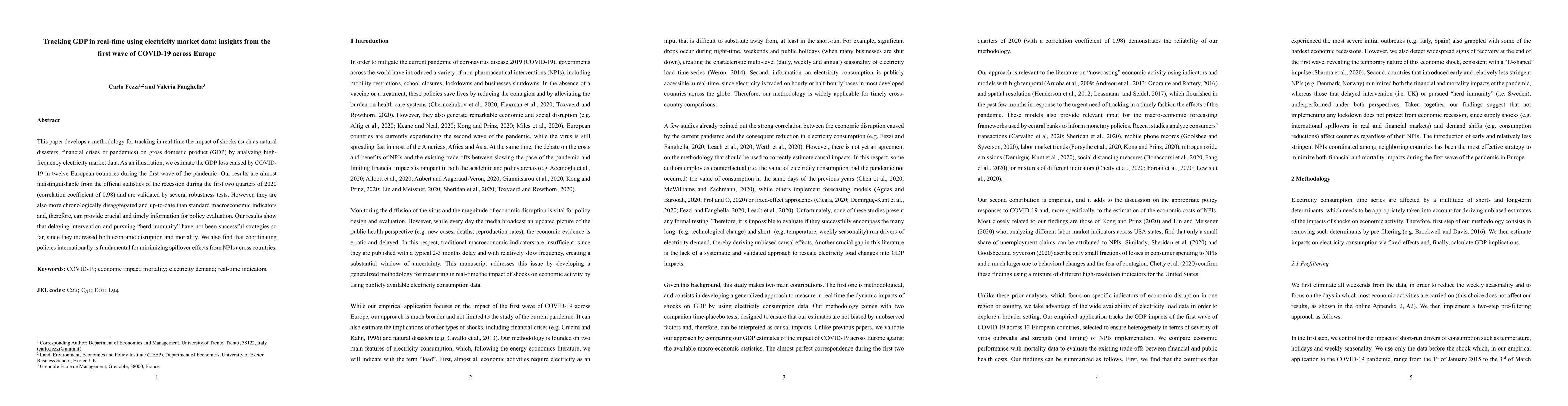 This paper develops a methodology for tracking in real time the impact of shocks (such as natural disasters, financial crises or pandemics) on gross domestic product (GDP) by analyzing high-frequency electricity market data. As an illustration, we estimate the GDP loss caused by COVID-19 in twelve European countries during the first wave of the pandemic. Our results are almost indistinguishable from the official statistics of the recession during the first two quarters of 2020 (correlation coefficient of 0.98) and are validated by several robustness tests. However, they are also more chronologically disaggregated and up-to-date than standard macroeconomic indicators and, therefore, can provide crucial and timely information for policy evaluation. Our results show that delaying intervention and pursuing 'herd immunity' have not been successful strategies so far, since they increased both economic disruption and mortality. We also find that coordinating policies internationally is fundamental for minimizing spillover effects from NPIs across countries.