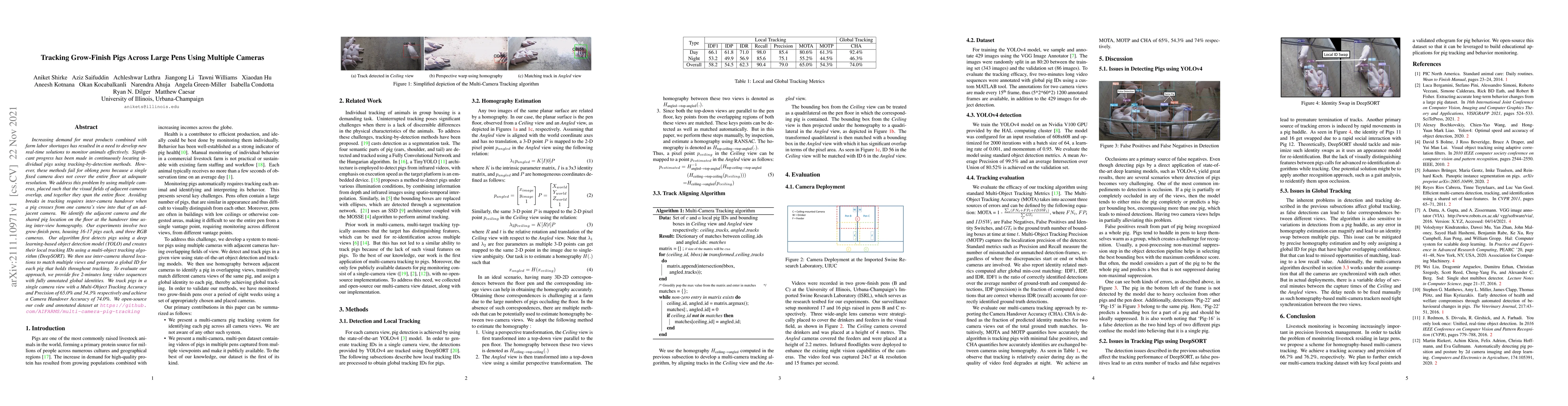 This paper proposes a multi-camera system to track grow-finish pigs across large oblong pens, addressing the limitations of single-camera tracking. The method uses overlapping camera fields and inter-camera handover to maintain continuous tracking, achieving a Multi-Object Tracking Accuracy of 65.0% and a Camera Handover Accuracy of 74.0%.