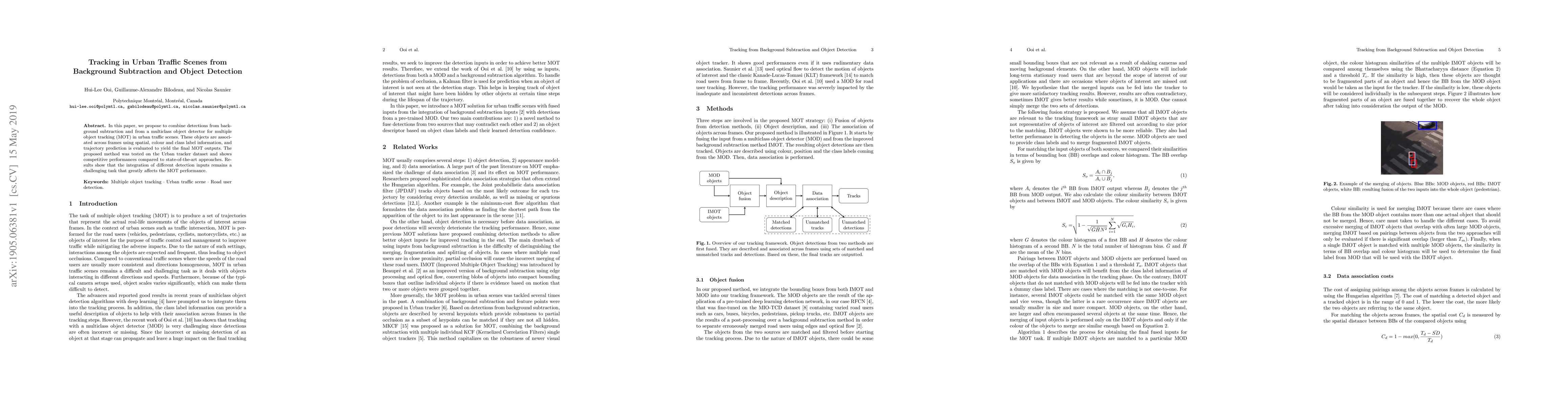 This paper proposes a method combining background subtraction and multiclass object detection for multiple object tracking in urban traffic scenes, achieving competitive performance on the Urban tracker dataset. The integration of different detection inputs remains a challenging aspect that significantly impacts tracking performance.