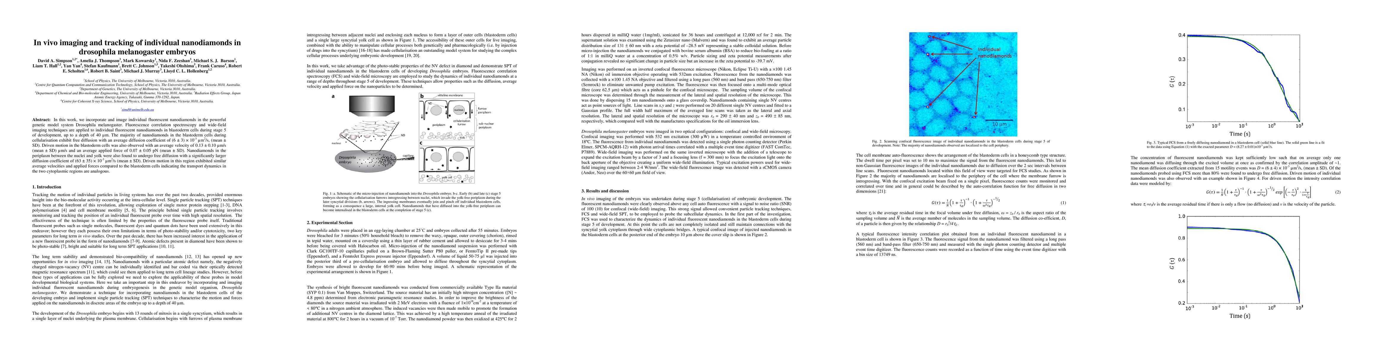 This study tracks individual fluorescent nanodiamonds in Drosophila melanogaster embryos to understand developmental dynamics. The nanodiamonds exhibit free diffusion and driven motion in blastoderm cells and periplasm regions, indicating similar transport mechanisms in both areas.