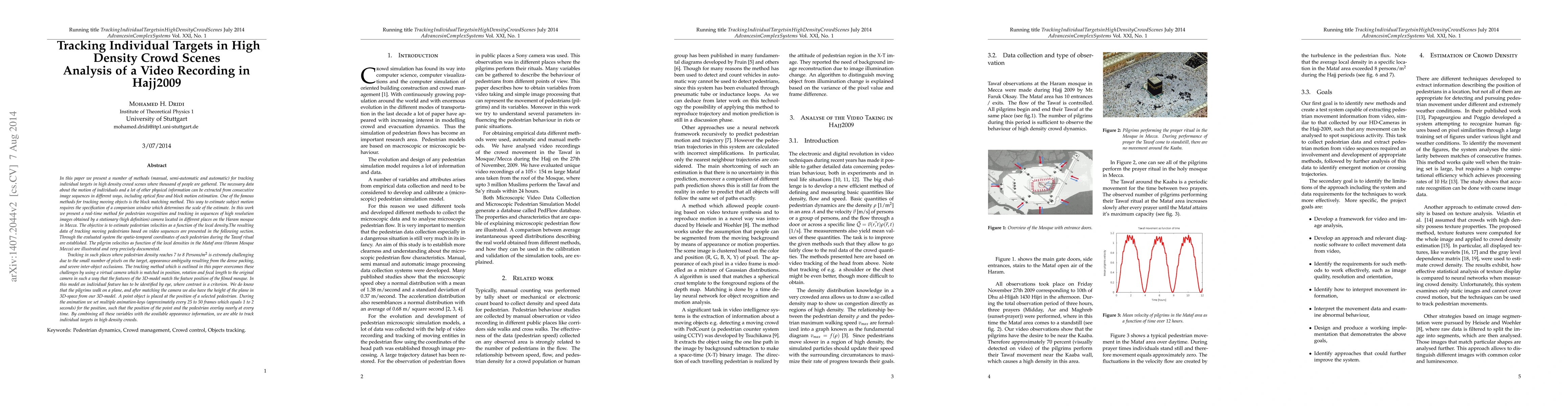 In this paper we present a number of methods (manual, semi-automatic and automatic) for tracking individual targets in high density crowd scenes where thousand of people are gathered. The necessary data about the motion of individuals and a lot of other physical information can be extracted from consecutive image sequences in different ways, including optical flow and block motion estimation. One of the famous methods for tracking moving objects is the block matching method. This way to estimate subject motion requires the specification of a comparison window which determines the scale of the estimate. In this work we present a real-time method for pedestrian recognition and tracking in sequences of high resolution images obtained by a stationary (high definition) camera located in different places on the Haram mosque in Mecca. The objective is to estimate pedestrian velocities as a function of the local density.The resulting data of tracking moving pedestrians based on video sequences are presented in the following section. Through the evaluated system the spatio-temporal coordinates of each pedestrian during the Tawaf ritual are established. The pilgrim velocities as function of the local densities in the Mataf area (Haram Mosque Mecca) are illustrated and very precisely documented.