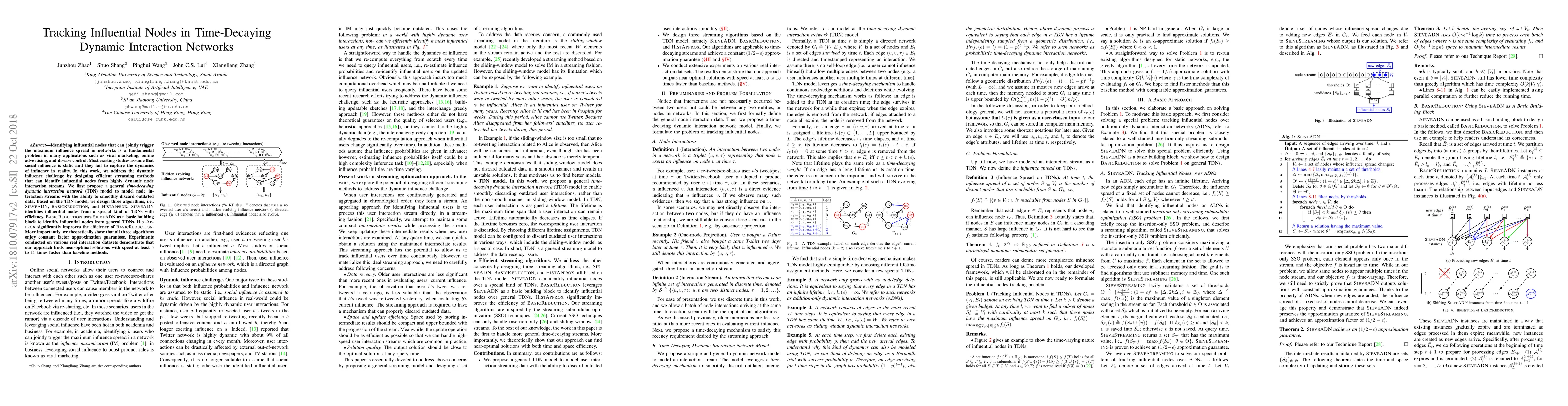 This paper proposes efficient streaming algorithms to identify influential nodes in dynamic interaction networks, addressing the challenge of time-decaying influence. The authors introduce a time-decaying dynamic interaction network model and three algorithms—SieveADN, BasicReduction, and HistApprox—that achieve near-optimal solutions with significant speed improvements over baseline methods.