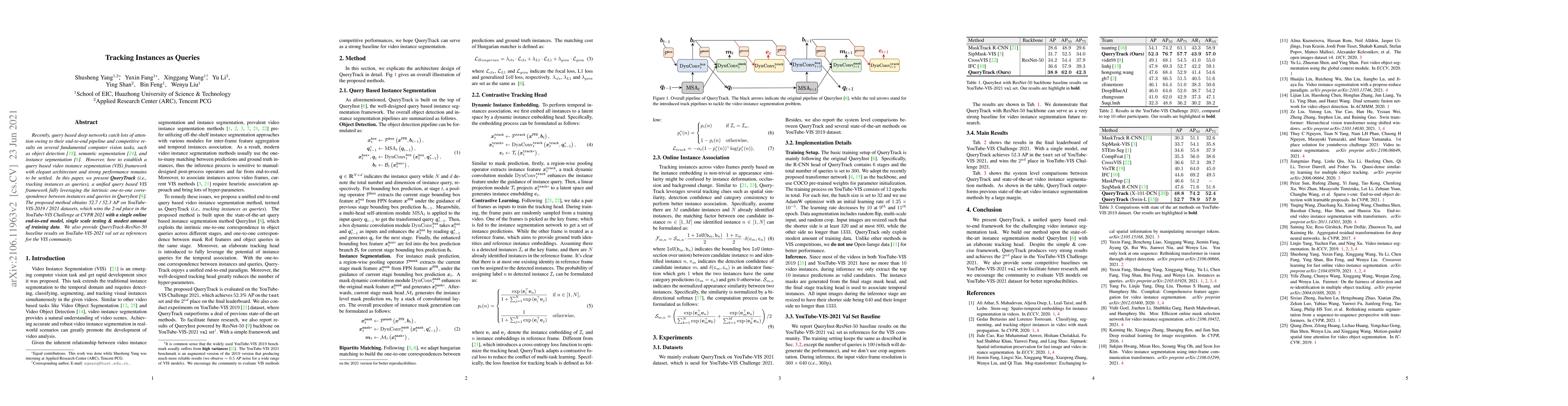 Recently, query based deep networks catch lots of attention owing to their end-to-end pipeline and competitive results on several fundamental computer vision tasks, such as object detection, semantic segmentation, and instance segmentation. However, how to establish a query based video instance segmentation (VIS) framework with elegant architecture and strong performance remains to be settled. In this paper, we present \textbf{QueryTrack} (i.e., tracking instances as queries), a unified query based VIS framework fully leveraging the intrinsic one-to-one correspondence between instances and queries in QueryInst. The proposed method obtains 52.7 / 52.3 AP on YouTube-VIS-2019 / 2021 datasets, which wins the 2-nd place in the YouTube-VIS Challenge at CVPR 2021 \textbf{with a single online end-to-end model, single scale testing \& modest amount of training data}. We also provide QueryTrack-ResNet-50 baseline results on YouTube-VIS-2021 val set as references for the VIS community.