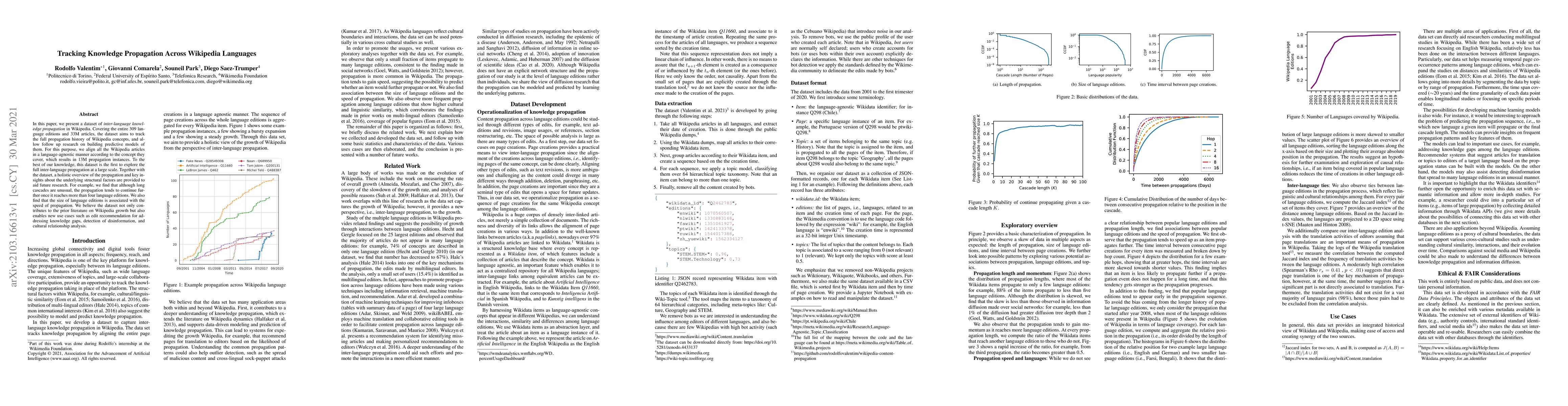 This paper introduces a comprehensive dataset tracking inter-language knowledge propagation across Wikipedia's 309 language editions, revealing insights into structural factors influencing propagation. The dataset, featuring 13M propagation instances, enables predictive modeling and applications like edit recommendations and disinformation detection.