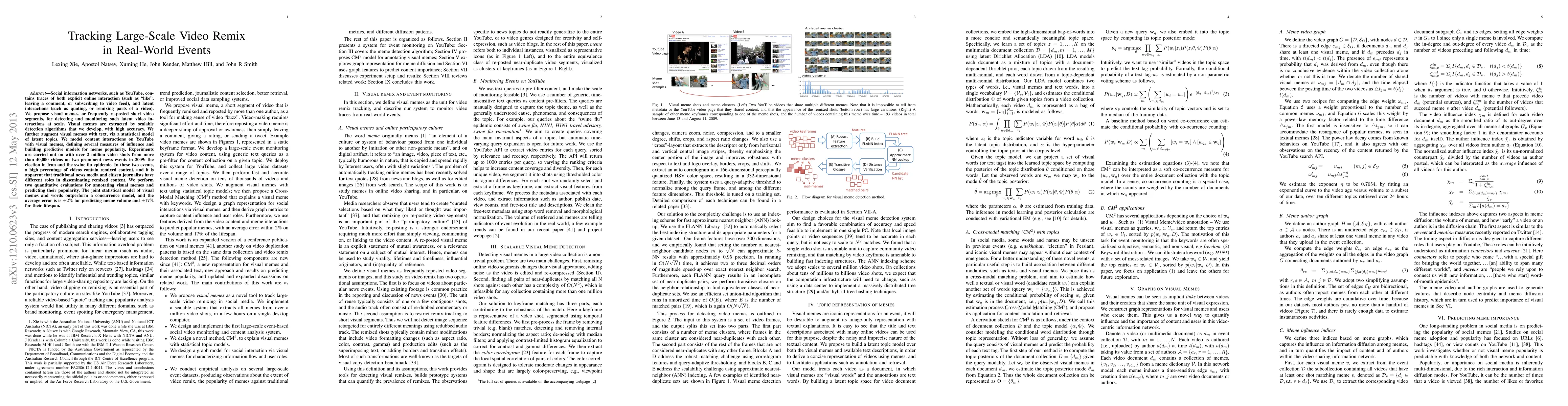 Social information networks, such as YouTube, contains traces of both explicit online interaction (such as "like", leaving a comment, or subscribing to video feed), and latent interactions (such as quoting, or remixing parts of a video). We propose visual memes, or frequently re-posted short video segments, for tracking such latent video interactions at scale. Visual memes are extracted by scalable detection algorithms that we develop, with high accuracy. We further augment visual memes with text, via a statistical model of latent topics. We model content interactions on YouTube with visual memes, defining several measures of influence and building predictive models for meme popularity. Experiments are carried out on with over 2 million video shots from more than 40,000 videos on two prominent news events in 2009: the election in Iran and the swine flu epidemic. In these two events, a high percentage of videos contain remixed content, and it is apparent that traditional news media and citizen journalists have different roles in disseminating remixed content. We perform two quantitative evaluations for annotating visual memes and predicting their popularity. The joint statistical model of visual memes and words outperform a concurrence model, and the average error is ~2% for predicting meme volume and ~17% for their lifespan.