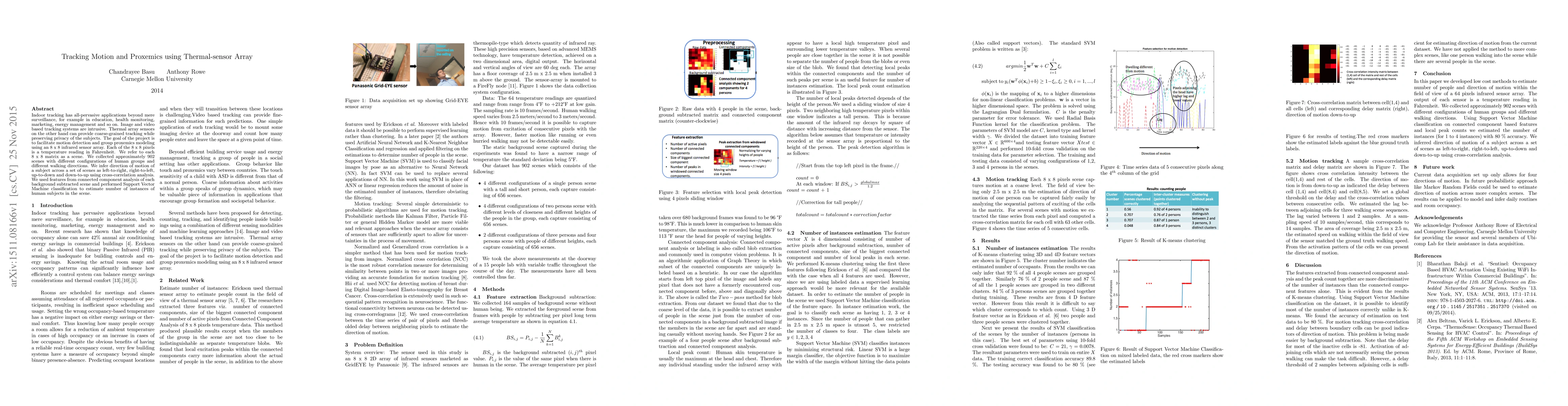 This research develops a non-intrusive thermal sensor array for indoor motion tracking and proxemics modeling, utilizing an 8 x 8 infrared sensor grid to detect subject movement direction and group size without violating privacy. The study employs cross-correlation and SVM classification for analyzing thermal data from collected scenes.