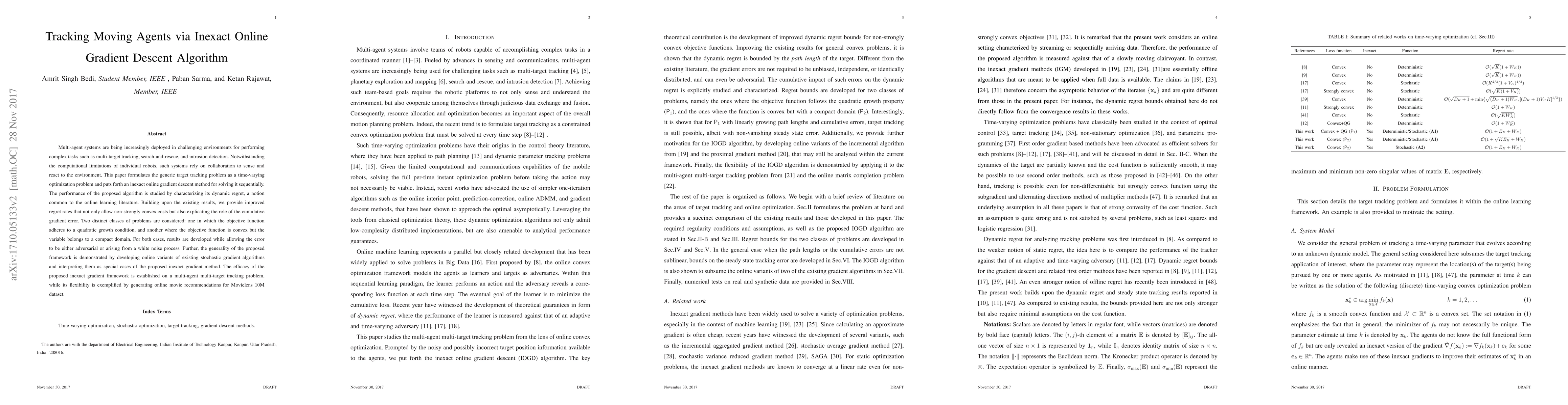 The paper proposes an inexact online gradient descent (IOGD) method for tracking moving agents in multi-agent systems, formulated as a time-varying optimization problem. It analyzes the performance using dynamic regret, a concept from online learning literature.
