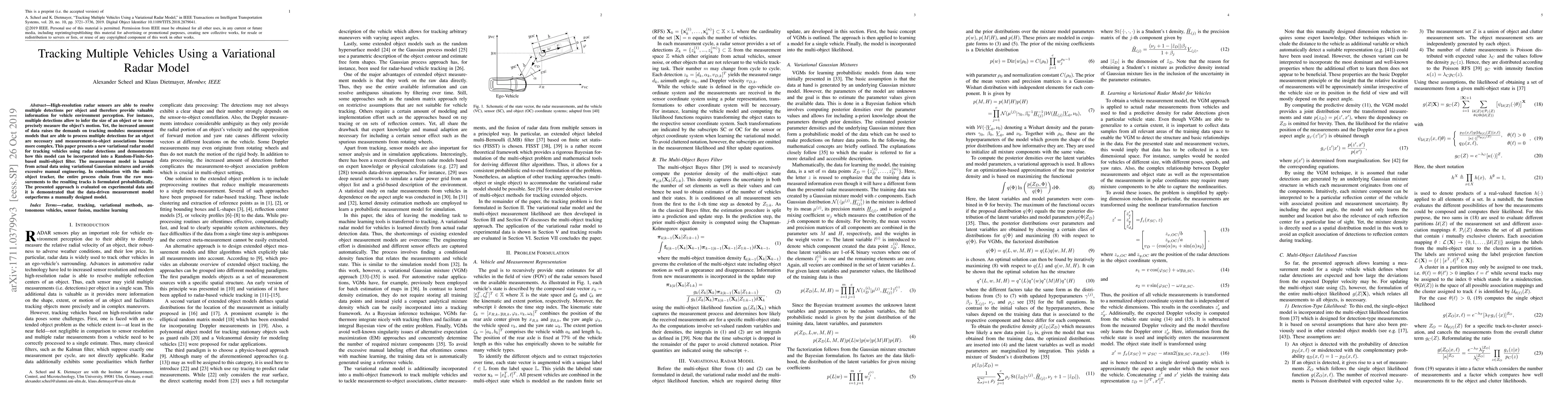 This paper introduces a variational radar model for tracking multiple vehicles using high-resolution radar data, which learns from actual data to handle complex measurement associations. The model is integrated into a Random-Finite-Set-based multi-object filter, demonstrating superior performance compared to manually designed models.