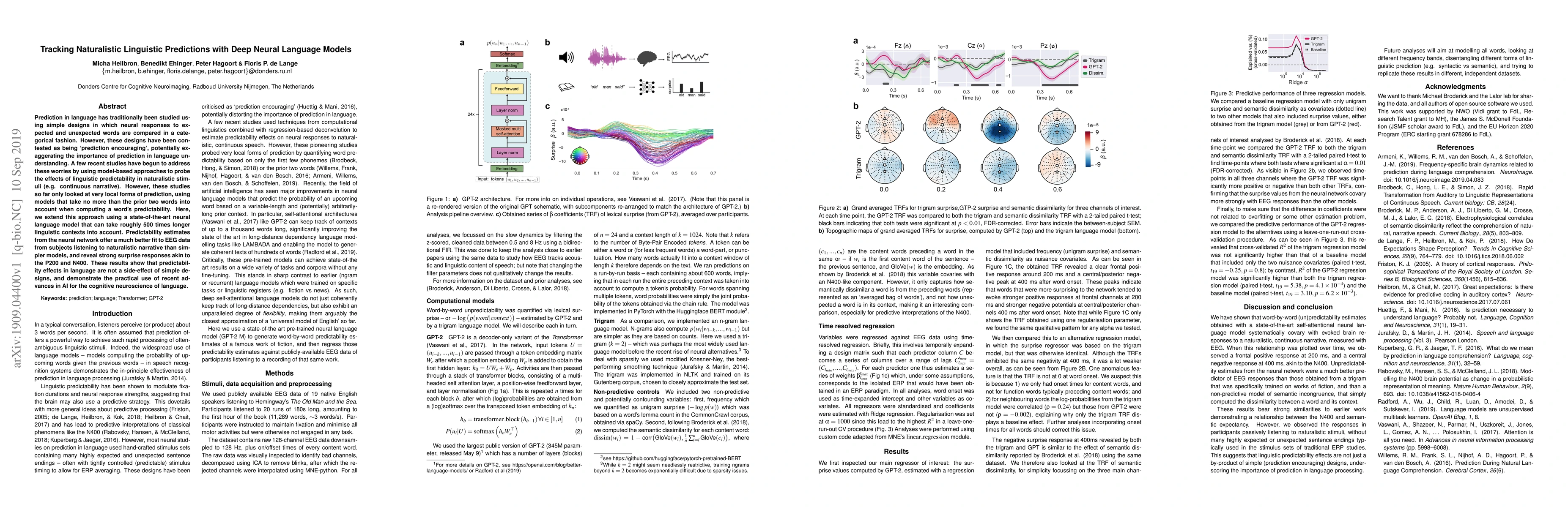 Prediction in language has traditionally been studied using simple designs in which neural responses to expected and unexpected words are compared in a categorical fashion. However, these designs have been contested as being `prediction encouraging', potentially exaggerating the importance of prediction in language understanding. A few recent studies have begun to address these worries by using model-based approaches to probe the effects of linguistic predictability in naturalistic stimuli (e.g. continuous narrative). However, these studies so far only looked at very local forms of prediction, using models that take no more than the prior two words into account when computing a word's predictability. Here, we extend this approach using a state-of-the-art neural language model that can take roughly 500 times longer linguistic contexts into account. Predictability estimates from the neural network offer a much better fit to EEG data from subjects listening to naturalistic narrative than simpler models, and reveal strong surprise responses akin to the P200 and N400. These results show that predictability effects in language are not a side-effect of simple designs, and demonstrate the practical use of recent advances in AI for the cognitive neuroscience of language.