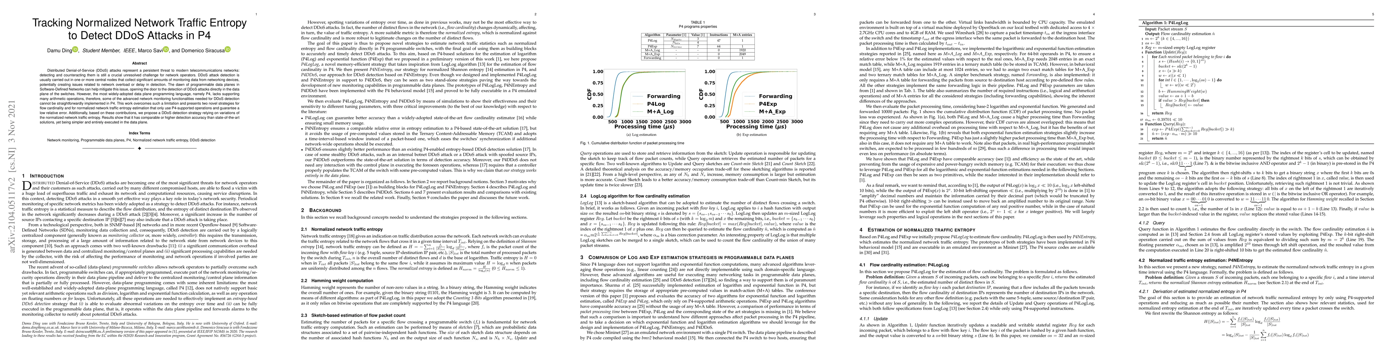 This paper proposes two novel strategies for estimating flow cardinality and normalized network traffic entropy using P4, enabling efficient DDoS attack detection within the data plane of switches. The proposed DDoS detection method based on traffic entropy variations demonstrates comparable or superior accuracy to existing methods while being simpler and fully executed in the data plane.