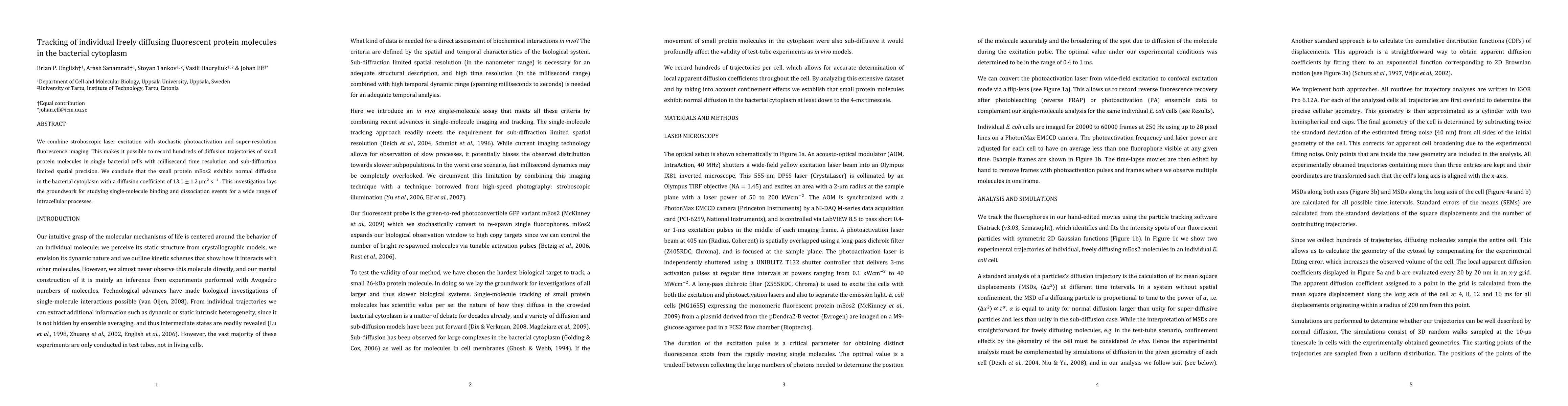 This study employs stroboscopic laser excitation and super-resolution imaging to track the diffusion of individual mEos2 protein molecules in bacterial cytoplasm, revealing normal diffusion with a coefficient of 13.1 ± 1.2 μm²/s. This technique enables detailed study of single-molecule interactions within cells.