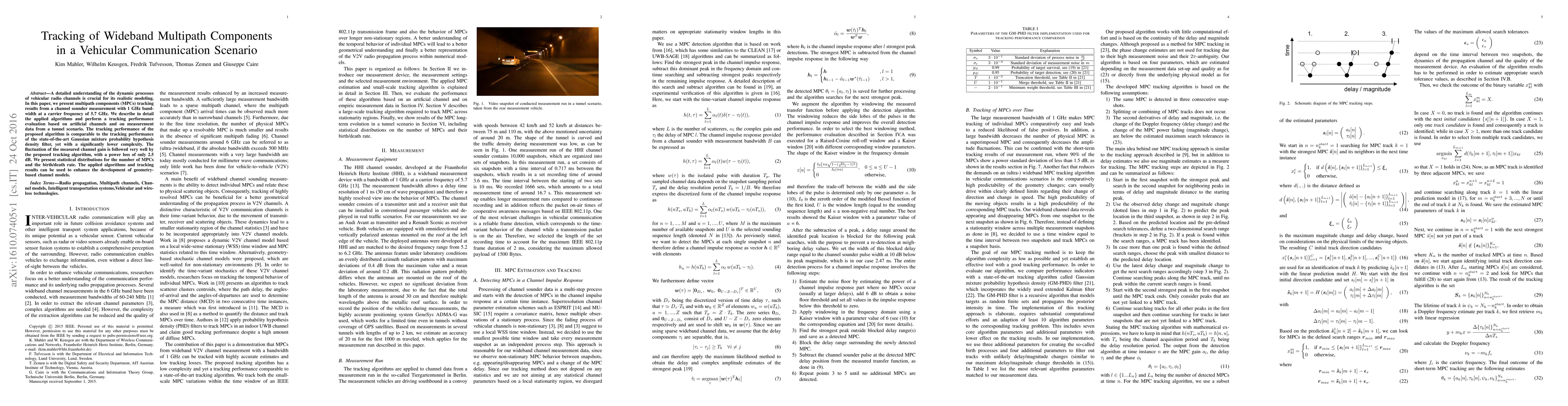 This paper presents a tracking algorithm for wideband multipath components in vehicular communication channels, demonstrating its effectiveness with a 1 GHz bandwidth measurement at 5.7 GHz. The proposed method shows comparable performance to state-of-the-art filters but with lower complexity and a 2.5 dB power loss.