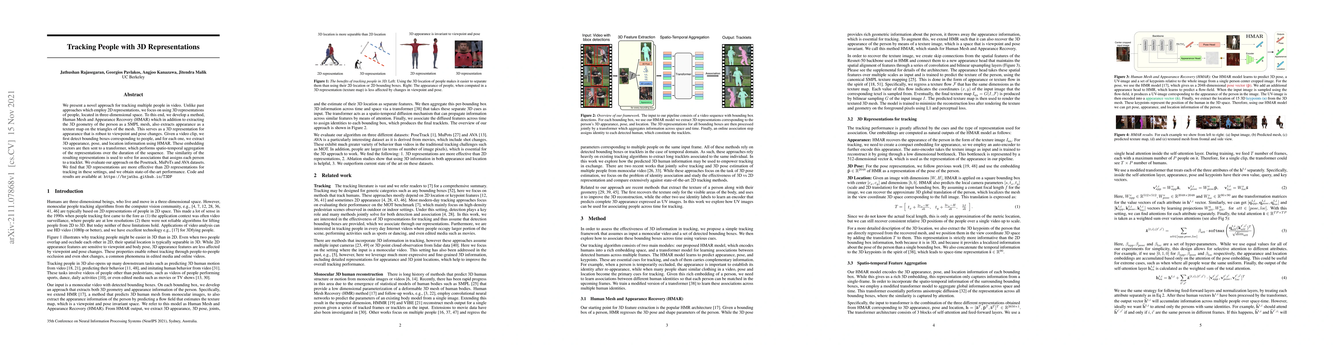 We present a novel approach for tracking multiple people in video. Unlike past approaches which employ 2D representations, we focus on using 3D representations of people, located in three-dimensional space. To this end, we develop a method, Human Mesh and Appearance Recovery (HMAR) which in addition to extracting the 3D geometry of the person as a SMPL mesh, also extracts appearance as a texture map on the triangles of the mesh. This serves as a 3D representation for appearance that is robust to viewpoint and pose changes. Given a video clip, we first detect bounding boxes corresponding to people, and for each one, we extract 3D appearance, pose, and location information using HMAR. These embedding vectors are then sent to a transformer, which performs spatio-temporal aggregation of the representations over the duration of the sequence. The similarity of the resulting representations is used to solve for associations that assigns each person to a tracklet. We evaluate our approach on the Posetrack, MuPoTs and AVA datasets. We find that 3D representations are more effective than 2D representations for tracking in these settings, and we obtain state-of-the-art performance. Code and results are available at: https://brjathu.github.io/T3DP.