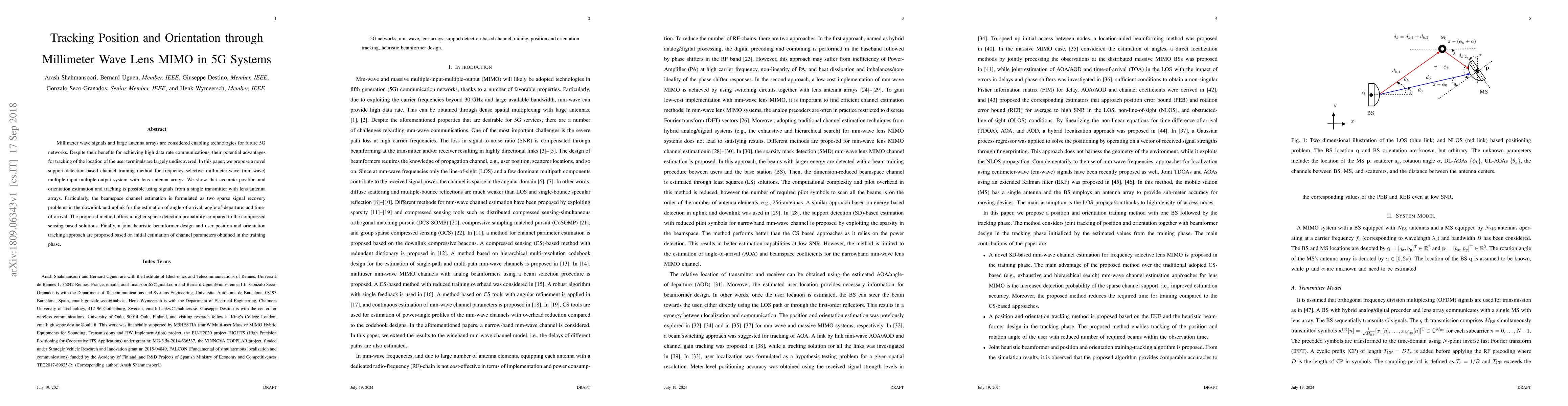 This paper proposes a novel support detection-based channel training method for 5G millimeter wave MIMO systems using lens antenna arrays, demonstrating accurate position and orientation tracking via beamspace channel estimation. The method enhances sparse detection probability and integrates a joint heuristic beamformer design for optimal tracking.