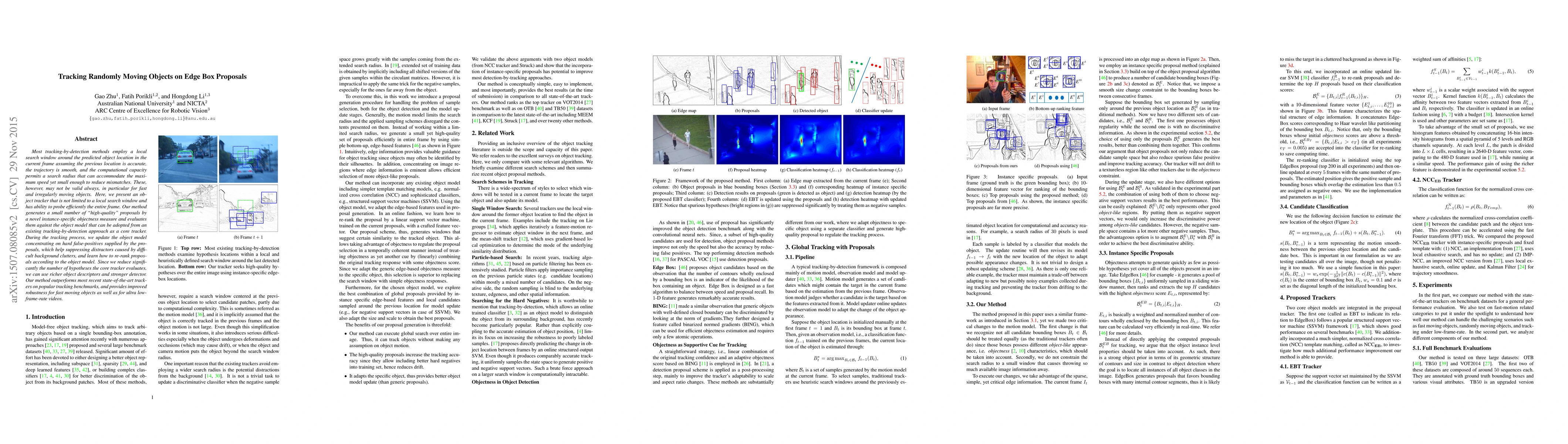 Most tracking-by-detection methods employ a local search window around the predicted object location in the current frame assuming the previous location is accurate, the trajectory is smooth, and the computational capacity permits a search radius that can accommodate the maximum speed yet small enough to reduce mismatches. These, however, may not be valid always, in particular for fast and irregularly moving objects. Here, we present an object tracker that is not limited to a local search window and has ability to probe efficiently the entire frame. Our method generates a small number of "high-quality" proposals by a novel instance-specific objectness measure and evaluates them against the object model that can be adopted from an existing tracking-by-detection approach as a core tracker. During the tracking process, we update the object model concentrating on hard false-positives supplied by the proposals, which help suppressing distractors caused by difficult background clutters, and learn how to re-rank proposals according to the object model. Since we reduce significantly the number of hypotheses the core tracker evaluates, we can use richer object descriptors and stronger detector. Our method outperforms most recent state-of-the-art trackers on popular tracking benchmarks, and provides improved robustness for fast moving objects as well as for ultra low-frame-rate videos.