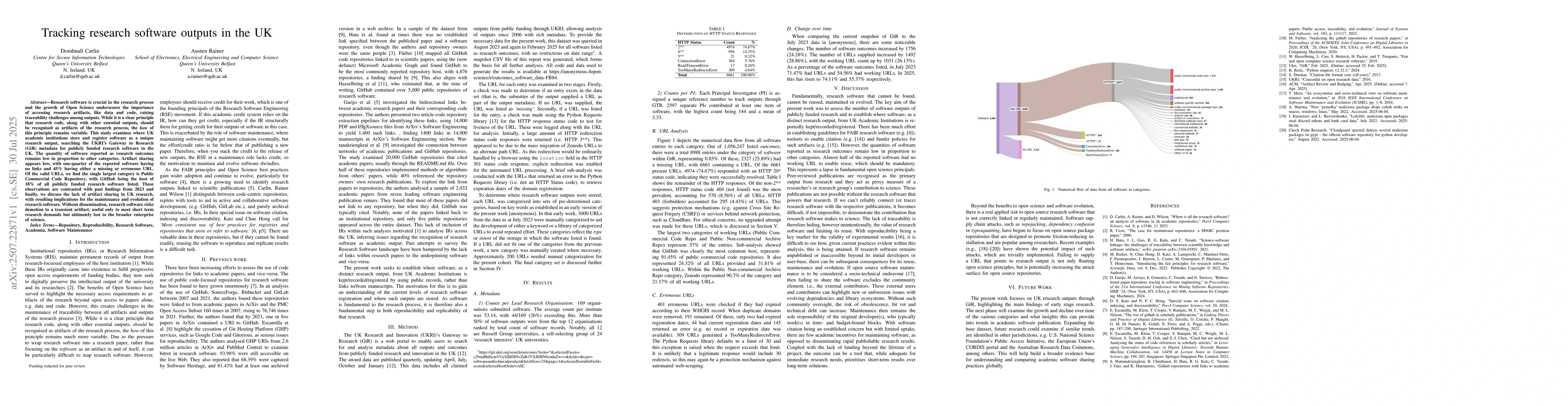 The paper presents a method for tracking research software outputs using GtR metadata, categorizing URLs, and analyzing their liveness and functionality.
