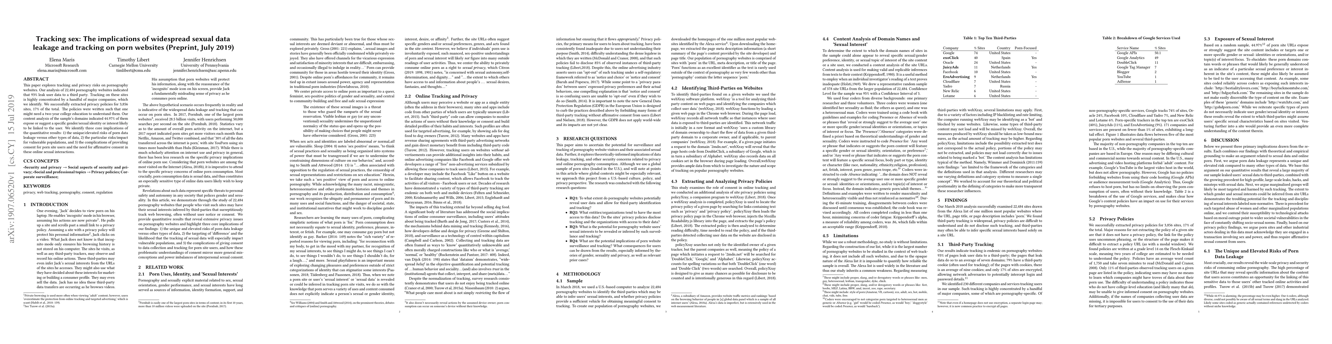 The study presents a methodology for tracking third-party requests and extracting privacy policies from pornography websites, providing insights into data leakage and user consent issues.