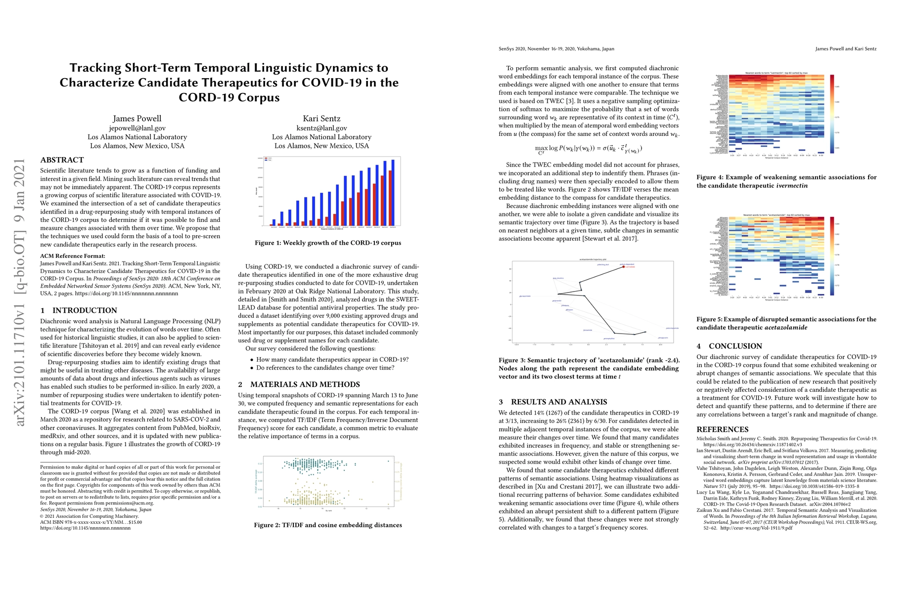 This study analyzes the CORD-19 corpus to track short-term linguistic dynamics of candidate therapeutics for COVID-19 over time, aiming to identify trends and changes in scientific literature. The proposed techniques could serve as an early-screening tool for new therapeutic candidates.