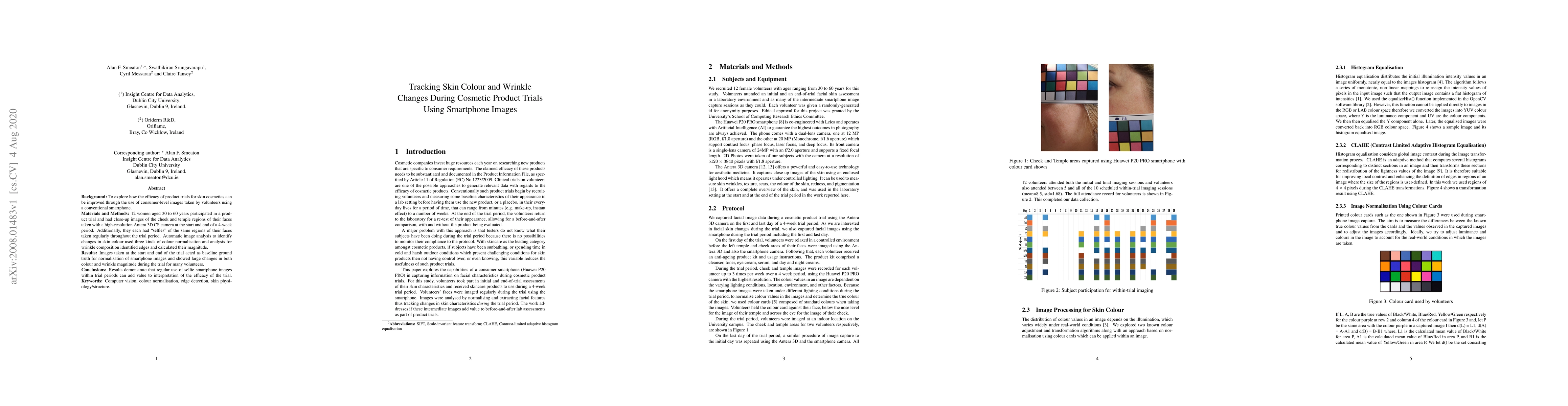 Background: To explore how the efficacy of product trials for skin cosmetics can be improved through the use of consumer-level images taken by volunteers using a conventional smartphone. Materials and Methods: 12 women aged 30 to 60 years participated in a product trial and had close-up images of the cheek and temple regions of their faces taken with a high-resolution Antera 3D CS camera at the start and end of a 4-week period. Additionally, they each had ``selfies'' of the same regions of their faces taken regularly throughout the trial period. Automatic image analysis to identify changes in skin colour used three kinds of colour normalisation and analysis for wrinkle composition identified edges and calculated their magnitude. Results: Images taken at the start and end of the trial acted as baseline ground truth for normalisation of smartphone images and showed large changes in both colour and wrinkle magnitude during the trial for many volunteers. Conclusions: Results demonstrate that regular use of selfie smartphone images within trial periods can add value to interpretation of the efficacy of the trial.