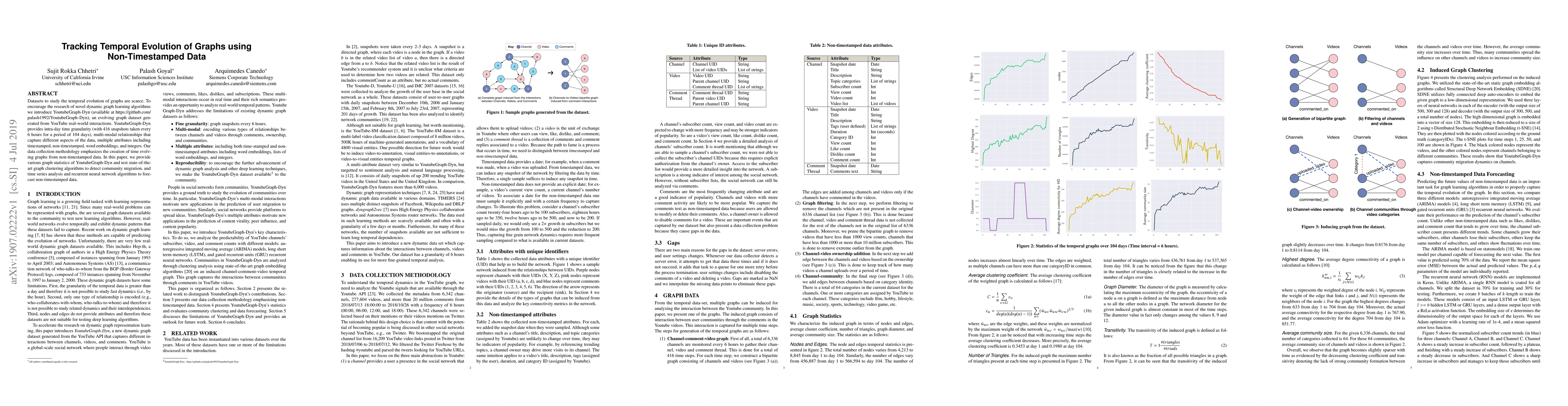 Datasets to study the temporal evolution of graphs are scarce. To encourage the research of novel dynamic graph learning algorithms we introduce YoutubeGraph-Dyn (available at https://github.com/palash1992/YoutubeGraph-Dyn), an evolving graph dataset generated from YouTube real-world interactions. YoutubeGraph-Dyn provides intra-day time granularity (with 416 snapshots taken every 6 hours for a period of 104 days), multi-modal relationships that capture different aspects of the data, multiple attributes including timestamped, non-timestamped, word embeddings, and integers. Our data collection methodology emphasizes the creation of time evolving graphs from non-timestamped data. In this paper, we provide various graph statistics of YoutubeGraph-Dyn and test state-of-the-art graph clustering algorithms to detect community migration, and time series analysis and recurrent neural network algorithms to forecast non-timestamped data.