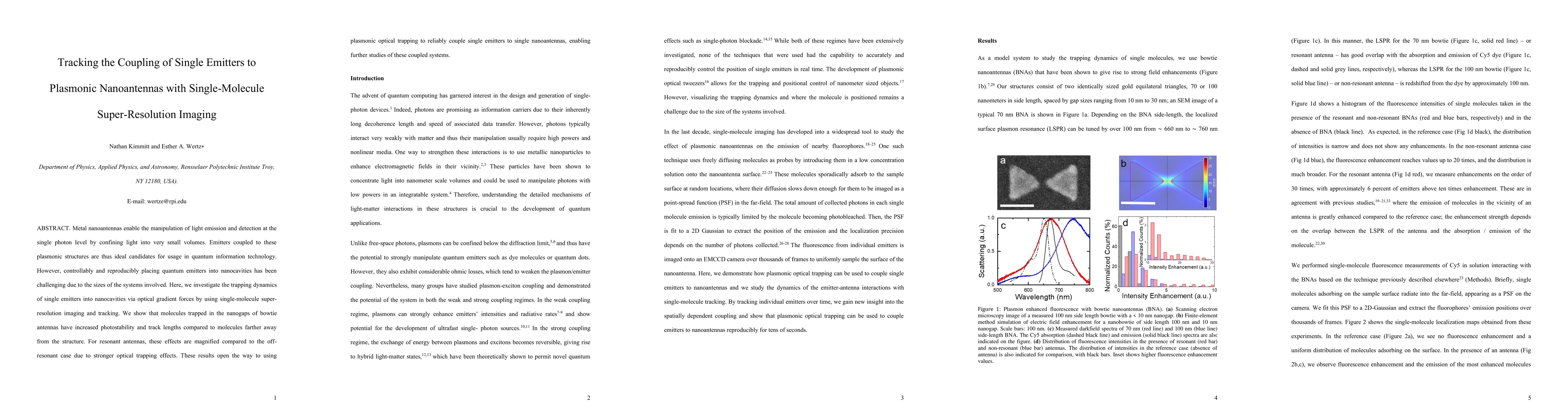 This paper explores the use of single-molecule super-resolution imaging to track the coupling dynamics of single emitters to plasmonic nanoantennas, revealing enhanced photostability and longer tracking times for emitters trapped in nanogaps, especially for resonant antennas. This method offers a pathway to reliably couple quantum emitters to nanoantennas for quantum information applications.