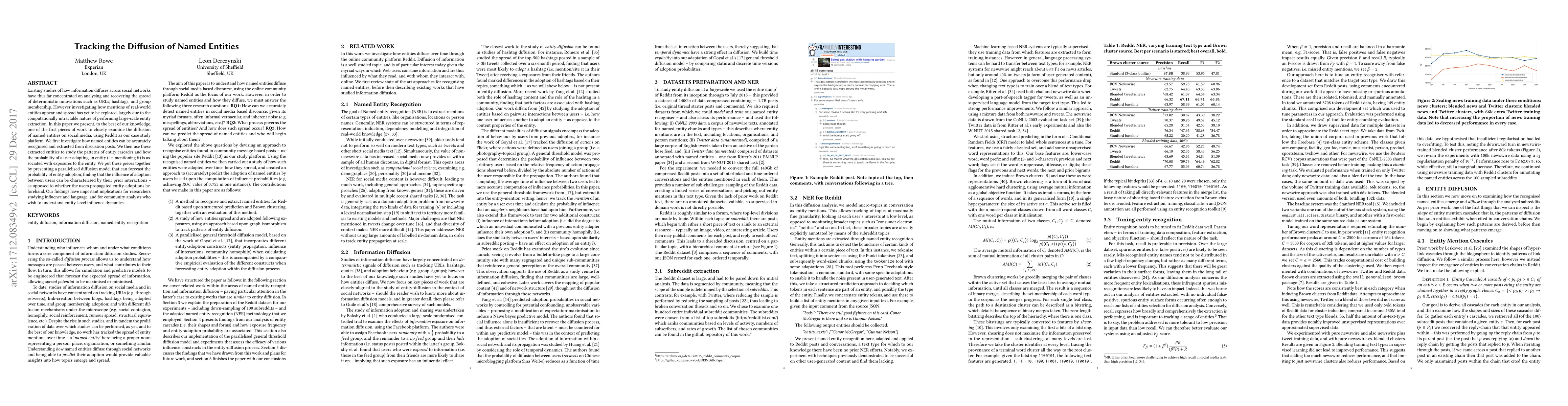Existing studies of how information diffuses across social networks have thus far concentrated on analysing and recovering the spread of deterministic innovations such as URLs, hashtags, and group membership. However investigating how mentions of real-world entities appear and spread has yet to be explored, largely due to the computationally intractable nature of performing large-scale entity extraction. In this paper we present, to the best of our knowledge, one of the first pieces of work to closely examine the diffusion of named entities on social media, using Reddit as our case study platform. We first investigate how named entities can be accurately recognised and extracted from discussion posts. We then use these extracted entities to study the patterns of entity cascades and how the probability of a user adopting an entity (i.e. mentioning it) is associated with exposures to the entity. We put these pieces together by presenting a parallelised diffusion model that can forecast the probability of entity adoption, finding that the influence of adoption between users can be characterised by their prior interactions -- as opposed to whether the users propagated entity-adoptions beforehand. Our findings have important implications for researchers studying influence and language, and for community analysts who wish to understand entity-level influence dynamics.