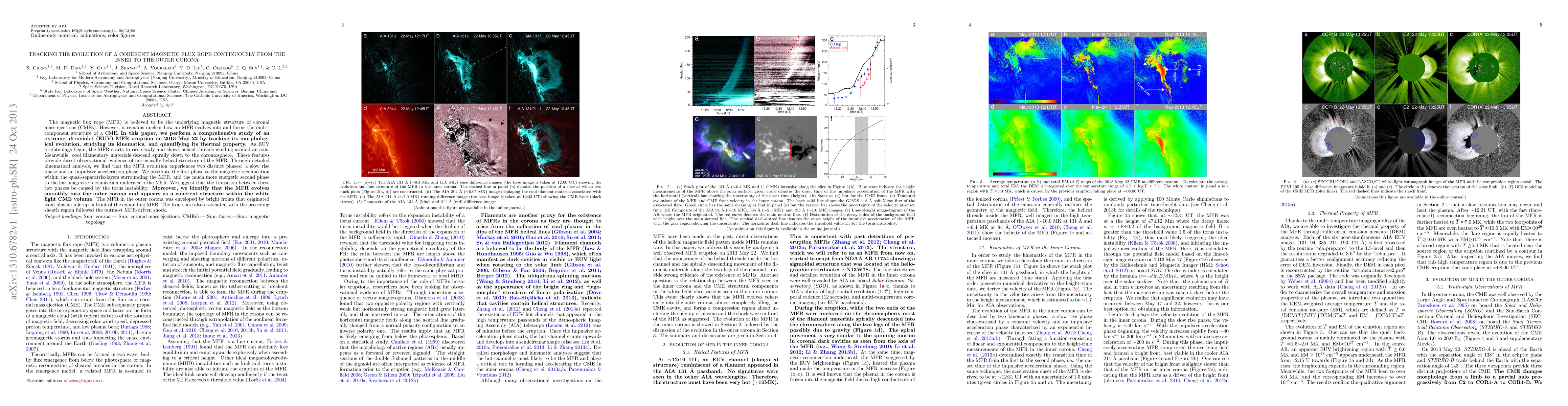 The magnetic flux rope (MFR) is believed to be the underlying magnetic structure of coronal mass ejections (CMEs). However, it remains unclear how an MFR evolves into and forms the multi-component structure of a CME. In this paper, we perform a comprehensive study of an extreme-ultraviolet (EUV) MFR eruption on 2013 May 22 by tracking its morphological evolution, studying its kinematics, and quantifying its thermal property. As EUV brightenings begin, the MFR starts to rise slowly and shows helical threads winding around an axis. Meanwhile, cool filamentary materials descend spirally down to the chromosphere. These features provide direct observational evidence of intrinsically helical structure of the MFR. Through detailed kinematical analysis, we find that the MFR evolution experiences two distinct phases: a slow rise phase and an impulsive acceleration phase. We attribute the first phase to the magnetic reconnection within the quasi-separatrix-layers surrounding the MFR, and the much more energetic second phase to the fast magnetic reconnection underneath the MFR. We suggest that the transition between these two phases be caused by the torus instability. Moreover, we identify that the MFR evolves smoothly into the outer corona and appears as a coherent structure within the white light CME volume. The MFR in the outer corona was enveloped by bright fronts that originated from plasma pile-up in front of the expanding MFR. The fronts are also associated with the preceding sheath region followed the outmost MFR-driven shock.