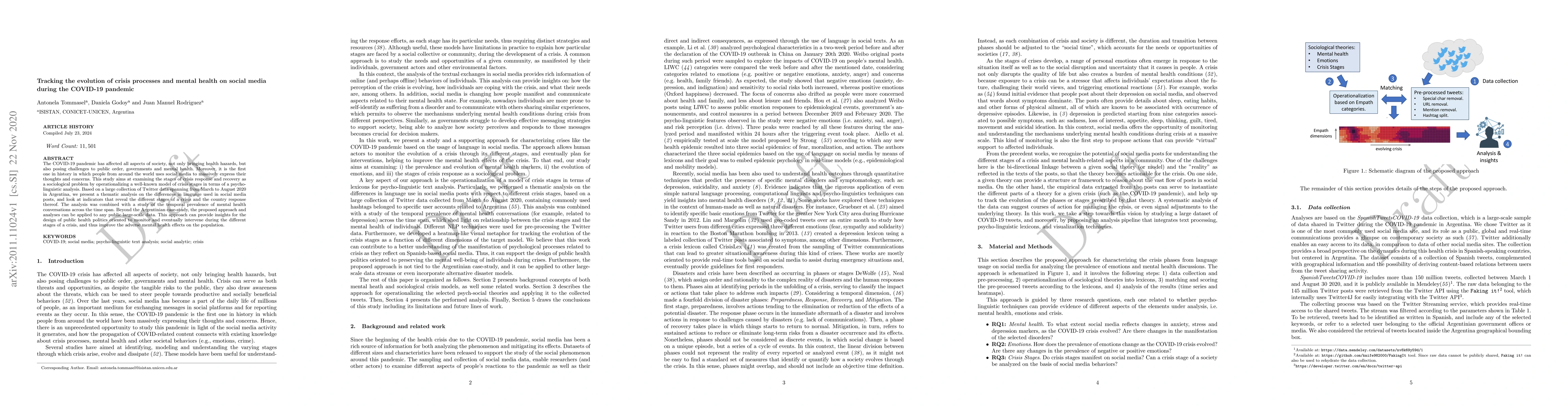 The COVID-19 pandemic has affected all aspects of society, not only bringing health hazards, but also posing challenges to public order, governments and mental health. Moreover, it is the first one in history in which people from around the world uses social media to massively express their thoughts and concerns. This study aims at examining the stages of crisis response and recovery as a sociological problem by operationalizing a well-known model of crisis stages in terms of a psycho-linguistic analysis. Based on a large collection of Twitter data spanning from March to August 2020 in Argentina, we present a thematic analysis on the differences in language used in social media posts, and look at indicators that reveal the different stages of a crisis and the country response thereof. The analysis was combined with a study of the temporal prevalence of mental health conversations across the time span. Beyond the Argentinian case-study, the proposed approach and analyses can be applied to any public large-scale data. This approach can provide insights for the design of public health politics oriented to monitor and eventually intervene during the different stages of a crisis, and thus improve the adverse mental health effects on the population.