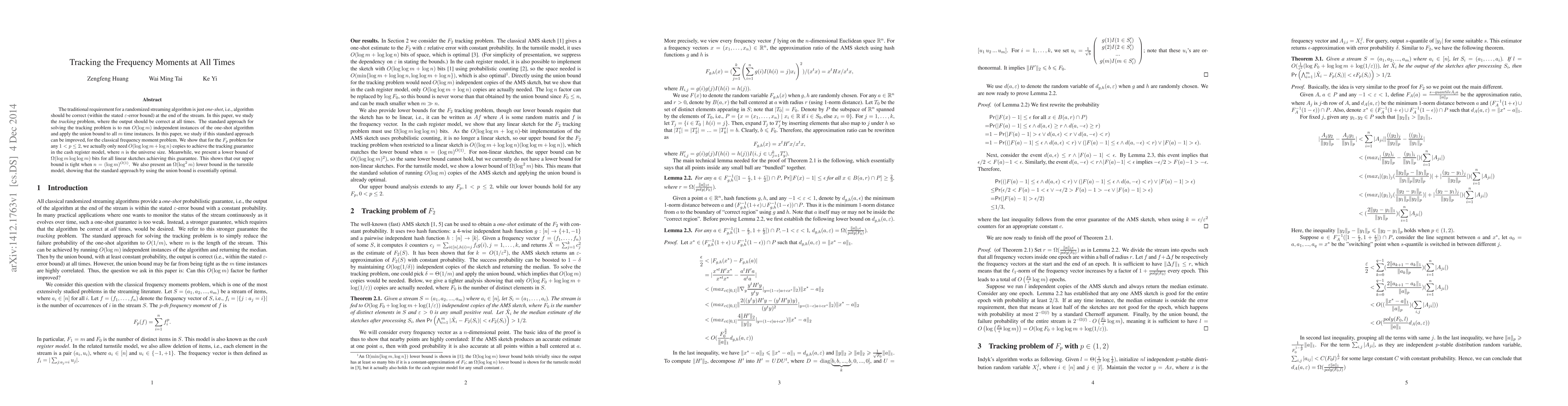 The traditional requirement for a randomized streaming algorithm is just {\em one-shot}, i.e., algorithm should be correct (within the stated $\eps$-error bound) at the end of the stream. In this paper, we study the {\em tracking} problem, where the output should be correct at all times. The standard approach for solving the tracking problem is to run $O(\log m)$ independent instances of the one-shot algorithm and apply the union bound to all $m$ time instances. In this paper, we study if this standard approach can be improved, for the classical frequency moment problem. We show that for the $F_p$ problem for any $1 < p \le 2$, we actually only need $O(\log \log m + \log n)$ copies to achieve the tracking guarantee in the cash register model, where $n$ is the universe size. Meanwhile, we present a lower bound of $\Omega(\log m \log\log m)$ bits for all linear sketches achieving this guarantee. This shows that our upper bound is tight when $n=(\log m)^{O(1)}$. We also present an $\Omega(\log^2 m)$ lower bound in the turnstile model, showing that the standard approach by using the union bound is essentially optimal.