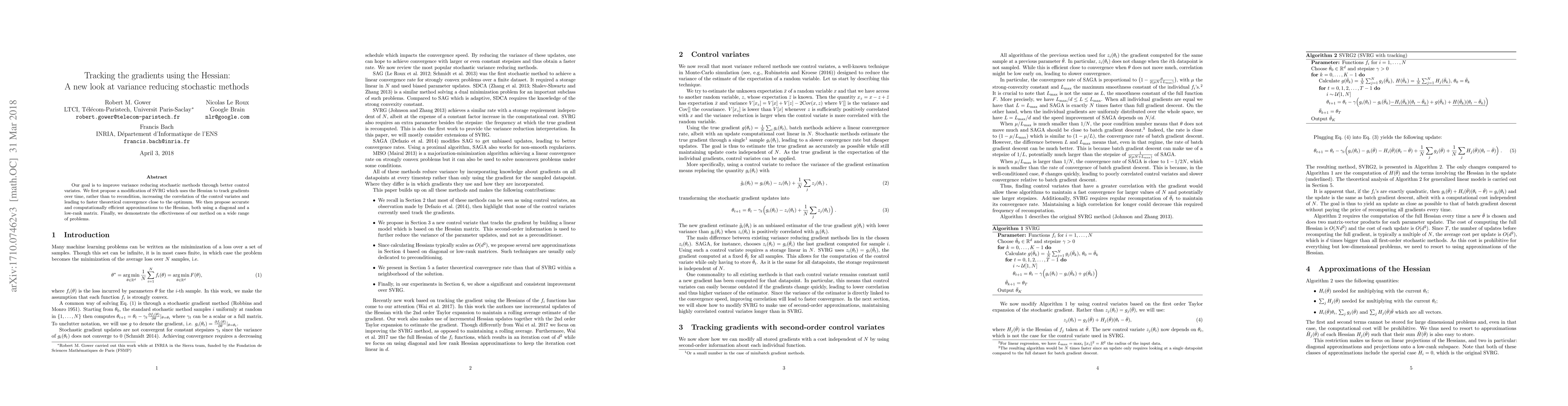 Our goal is to improve variance reducing stochastic methods through better control variates. We first propose a modification of SVRG which uses the Hessian to track gradients over time, rather than to recondition, increasing the correlation of the control variates and leading to faster theoretical convergence close to the optimum. We then propose accurate and computationally efficient approximations to the Hessian, both using a diagonal and a low-rank matrix. Finally, we demonstrate the effectiveness of our method on a wide range of problems.