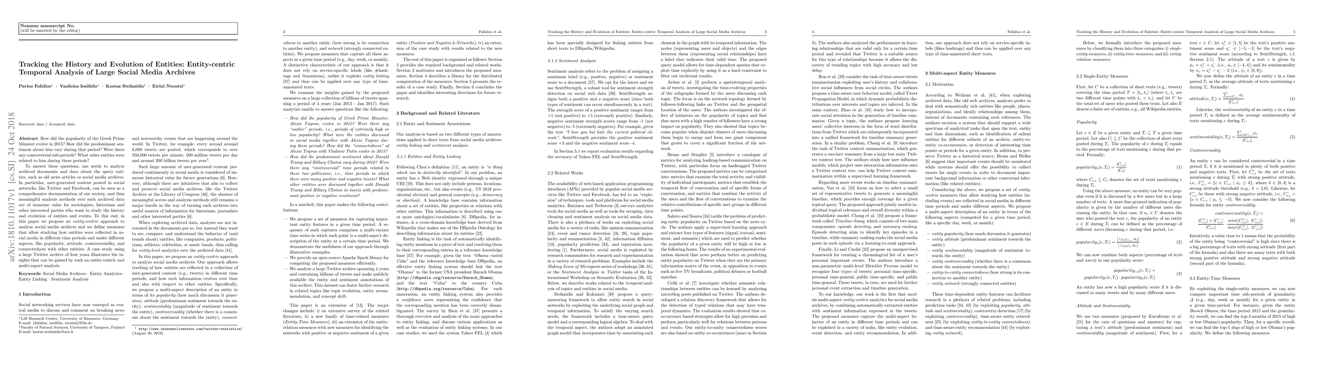 This paper proposes an entity-centric temporal analysis method to study the evolution of entities in large social media archives, focusing on popularity, sentiment, and relationships. A case study on the Greek Prime Minister in 2015 demonstrates the method's ability to reveal historical trends and controversial periods.