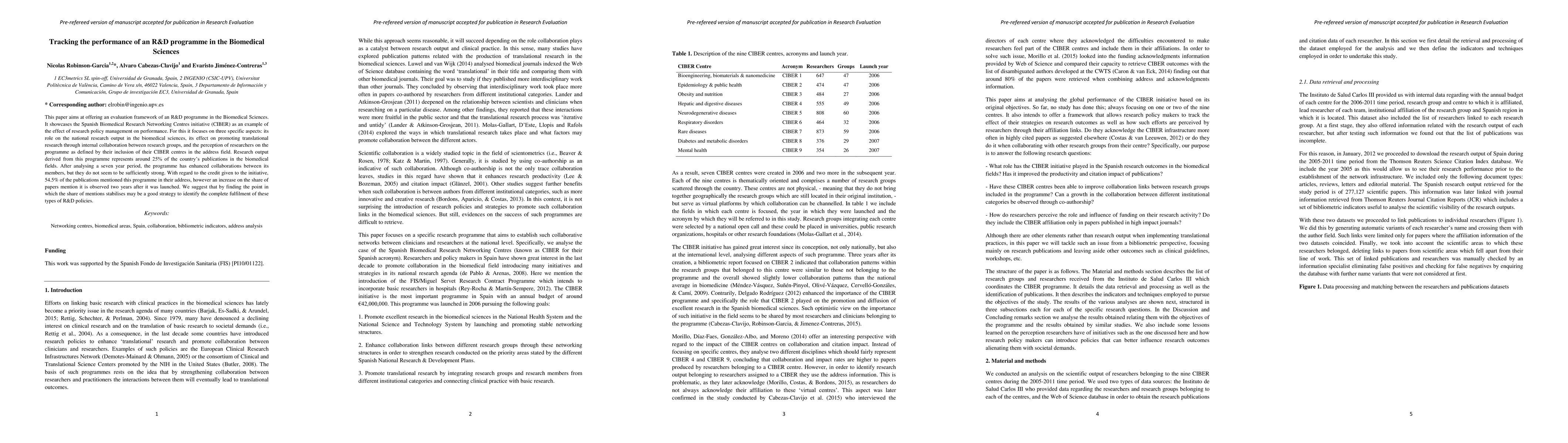 This paper aims at offering an evaluation framework of an Research and Development programme in the Biomedical Sciences. It showcases the Spanish Biomedical Research Networking Centres initiative (CIBER) as an example of the effect of research policy management on performance. For this it focuses on three specific aspects: its role on the national research output in the biomedical sciences, its effect on promoting translational research through internal collaboration between research groups, and the perception of researchers on the programme as defined by their inclusion of their CIBER centres in the address field. Research output derived from this programme represents around 25 per cent of the country's publications in the biomedical fields. After analysing a seven year period, the programme has enhanced collaborations between its members, but they do not seem to be sufficiently strong. With regard to the credit given to the initiative, 54.5 per cent of the publications mentioned this programme in their address, however an increase on the share of papers mention it is observed two years after it was launched. We suggest that by finding the point in which the share of mentions stabilises may be a good strategy to identify the complete fulfilment of these types of Research and Development policies.