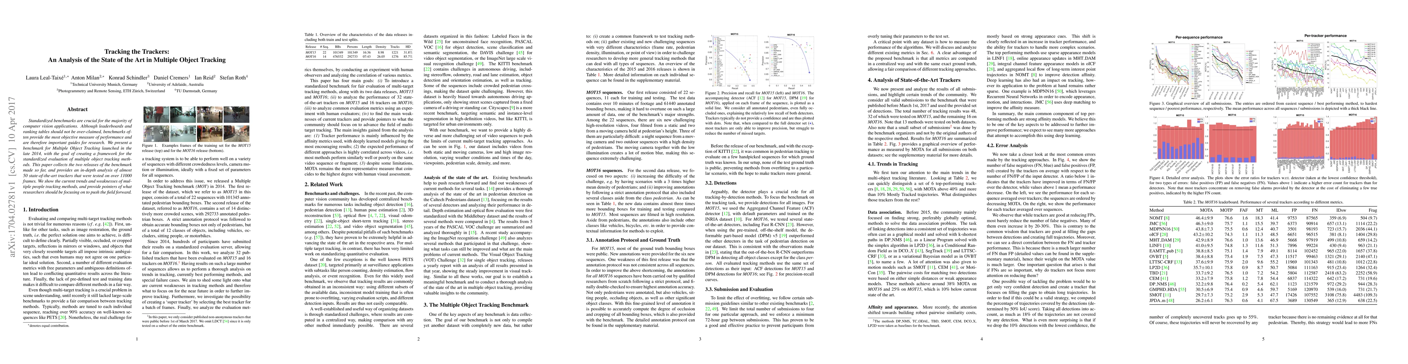 This paper introduces a comprehensive benchmark for evaluating multiple object tracking methods, analyzing nearly 50 state-of-the-art trackers across over 11,000 frames. It highlights current trends and weaknesses in the field, guiding future research directions.