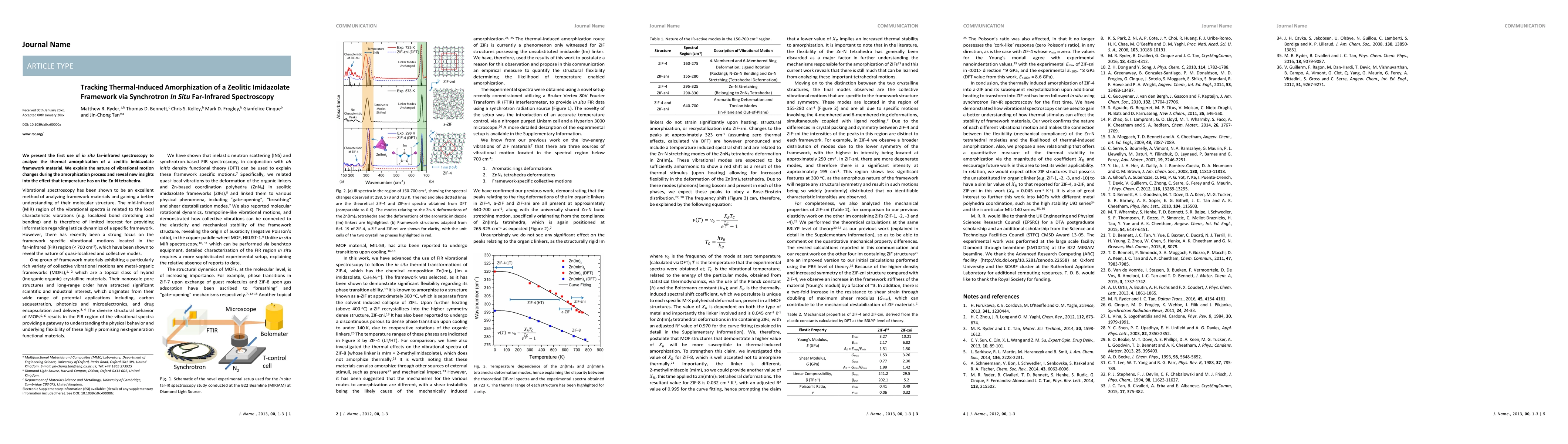 This paper utilizes synchrotron in situ far-infrared spectroscopy to track thermal-induced amorphization in a zeolitic imidazolate framework, revealing changes in vibrational motion and the impact of temperature on Zn-N tetrahedra during the amorphization process.