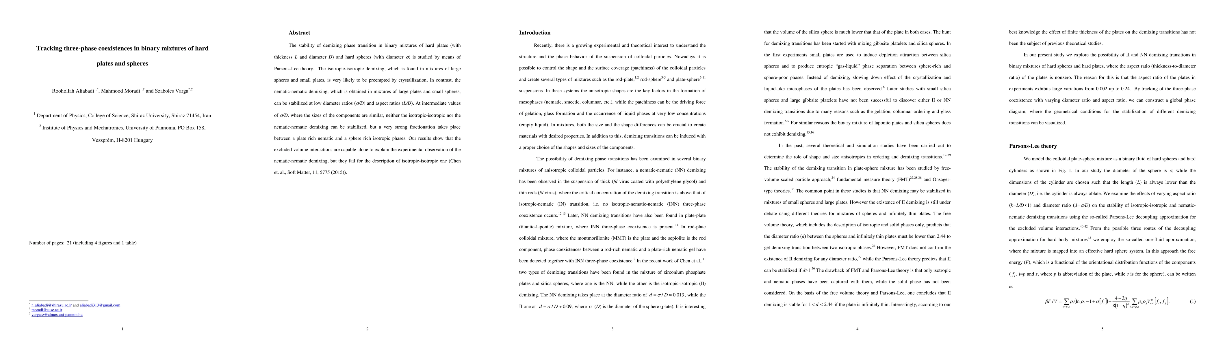 This study investigates the stability of demixing phase transitions in binary mixtures of hard plates and spheres using Parsons-Lee theory, revealing that nematic-nematic demixing is favored in mixtures of large plates and small spheres, while isotropic-isotropic demixing is preempted by crystallization. The research highlights the role of excluded volume interactions in stabilizing nematic-nematic demixing but not isotropic-isotropic demixing.
