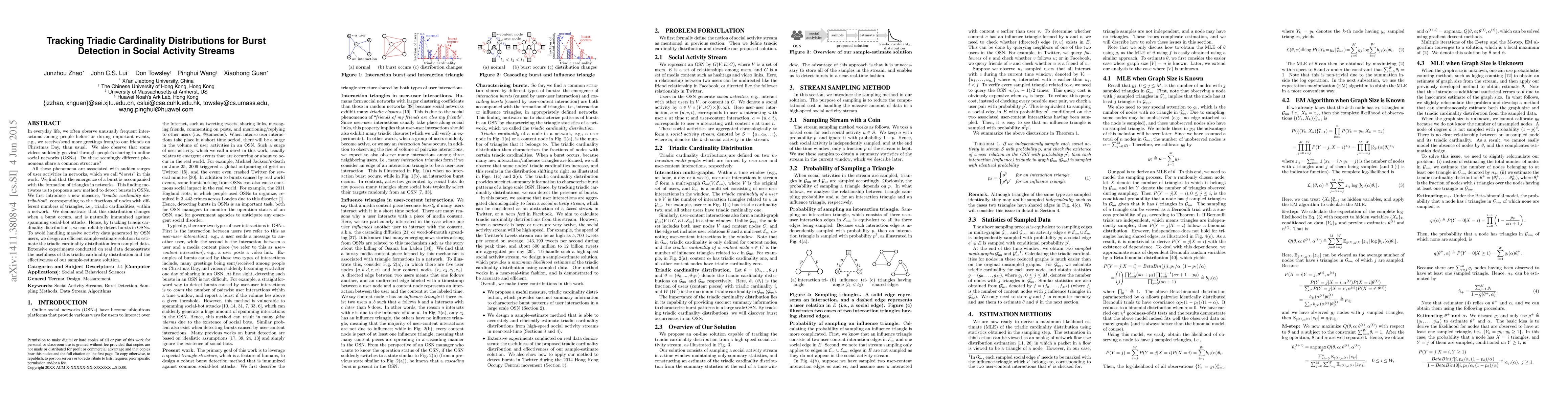 In everyday life, we often observe unusually frequent interactions among people before or during important events, e.g., we receive/send more greetings from/to our friends on Christmas Day, than usual. We also observe that some videos suddenly go viral through people's sharing in online social networks (OSNs). Do these seemingly different phenomena share a common structure? All these phenomena are associated with sudden surges of user activities in networks, which we call "bursts" in this work. We find that the emergence of a burst is accompanied with the formation of triangles in networks. This finding motivates us to propose a new method to detect bursts in OSNs. We first introduce a new measure, "triadic cardinality distribution", corresponding to the fractions of nodes with different numbers of triangles, i.e., triadic cardinalities, within a network. We demonstrate that this distribution changes when a burst occurs, and is naturally immunized against spamming social-bot attacks. Hence, by tracking triadic cardinality distributions, we can reliably detect bursts in OSNs. To avoid handling massive activity data generated by OSN users, we design an efficient sample-estimate solution to estimate the triadic cardinality distribution from sampled data. Extensive experiments conducted on real data demonstrate the usefulness of this triadic cardinality distribution and the effectiveness of our sample-estimate solution.