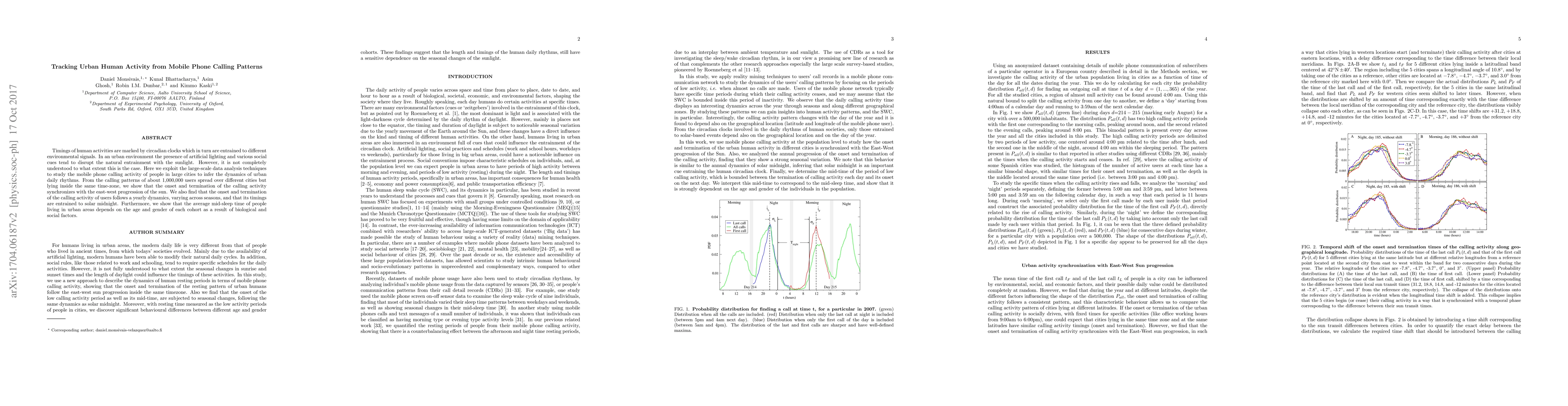 This study uses mobile phone calling data to analyze urban human activity patterns, revealing that calling activity onset and termination align with the sun's east-west progression and solar midnight, while also showing seasonal variations and demographic influences on mid-sleep times.