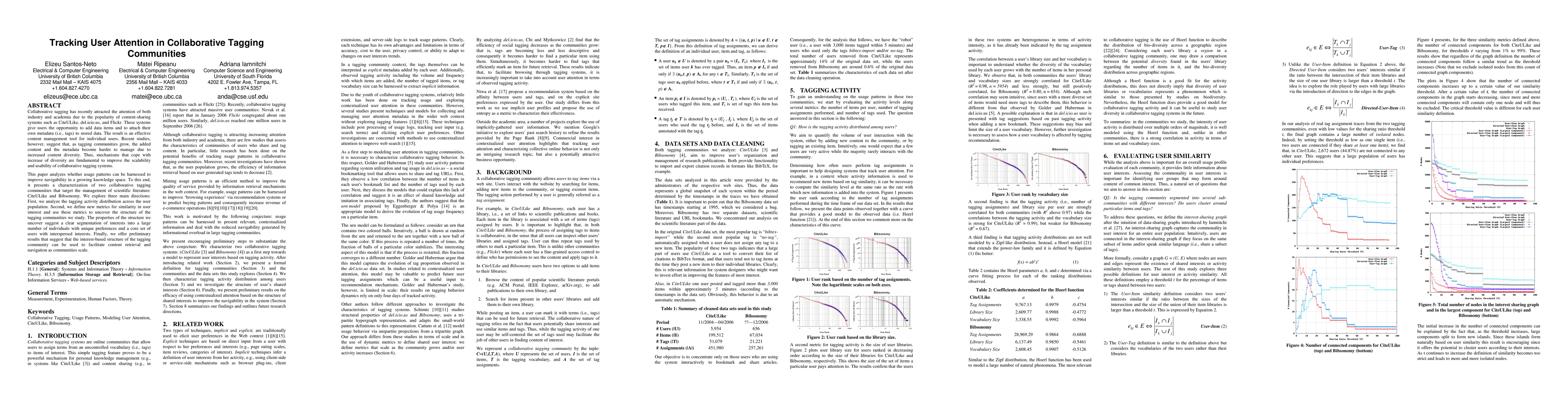 Collaborative tagging has recently attracted the attention of both industry and academia due to the popularity of content-sharing systems such as CiteULike, del.icio.us, and Flickr. These systems give users the opportunity to add data items and to attach their own metadata (or tags) to stored data. The result is an effective content management tool for individual users. Recent studies, however, suggest that, as tagging communities grow, the added content and the metadata become harder to manage due to an ease in content diversity. Thus, mechanisms that cope with increase of diversity are fundamental to improve the scalability and usability of collaborative tagging systems. This paper analyzes whether usage patterns can be harnessed to improve navigability in a growing knowledge space. To this end, it presents a characterization of two collaborative tagging communities that target scientific literature: CiteULike and Bibsonomy. We explore three main directions: First, we analyze the tagging activity distribution across the user population. Second, we define new metrics for similarity in user interest and use these metrics to uncover the structure of the tagging communities we study. The structure we uncover suggests a clear segmentation of interests into a large number of individuals with unique preferences and a core set of users with interspersed interests. Finally, we offer preliminary results that demonstrate that the interest-based structure of the tagging community can be used to facilitate content usage as communities scale.