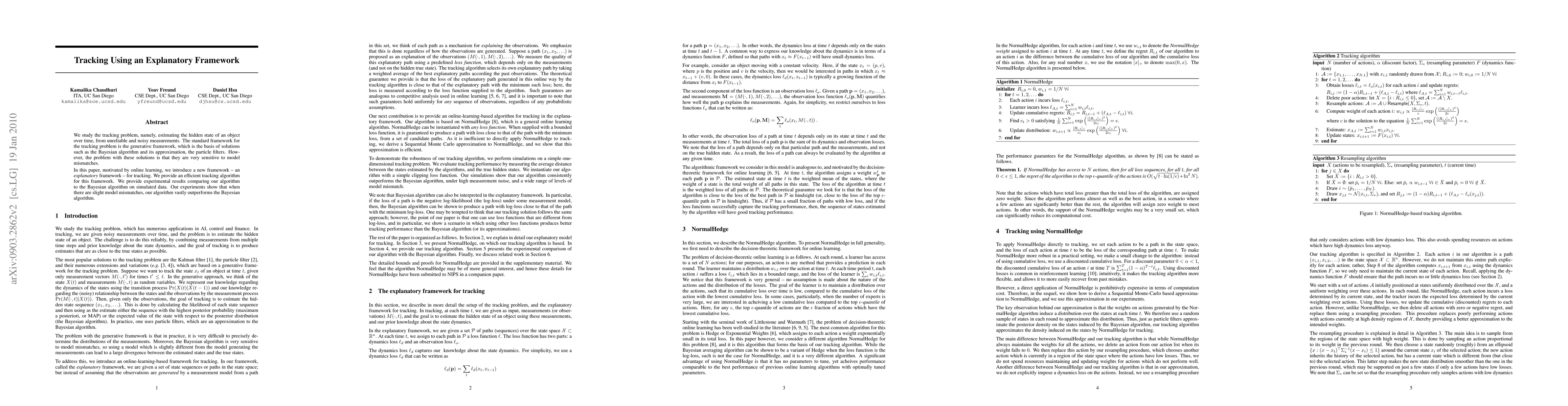 We study the tracking problem, namely, estimating the hidden state of an object over time, from unreliable and noisy measurements. The standard framework for the tracking problem is the generative framework, which is the basis of solutions such as the Bayesian algorithm and its approximation, the particle filters. However, the problem with these solutions is that they are very sensitive to model mismatches. In this paper, motivated by online learning, we introduce a new framework -- an {\em explanatory} framework -- for tracking. We provide an efficient tracking algorithm for this framework. We provide experimental results comparing our algorithm to the Bayesian algorithm on simulated data. Our experiments show that when there are slight model mismatches, our algorithm vastly outperforms the Bayesian algorithm.