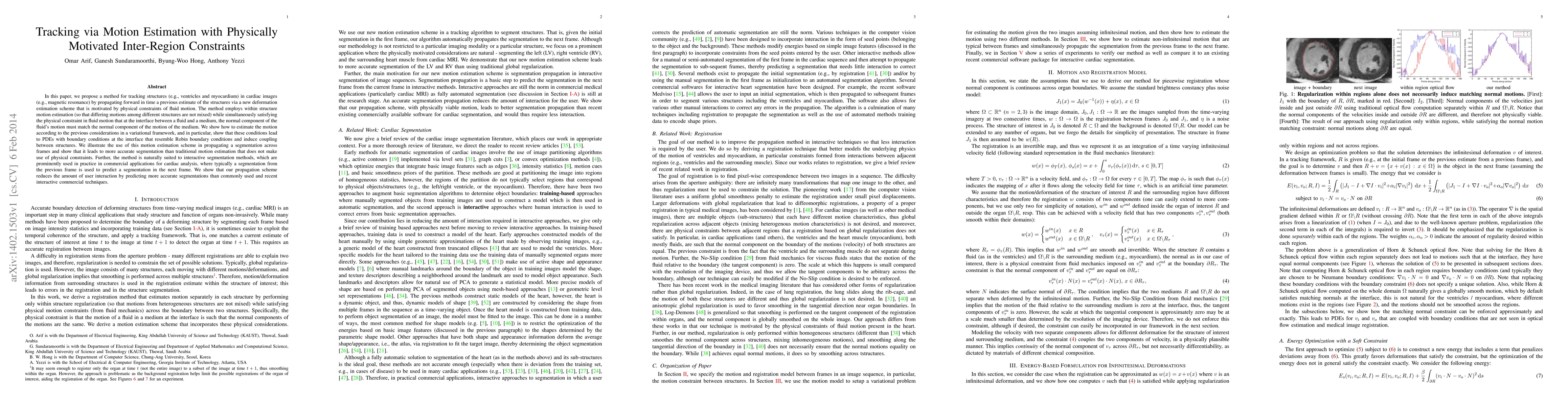 In this paper, we propose a method for tracking structures (e.g., ventricles and myocardium) in cardiac images (e.g., magnetic resonance) by propagating forward in time a previous estimate of the structures via a new deformation estimation scheme that is motivated by physical constraints of fluid motion. The method employs within structure motion estimation (so that differing motions among different structures are not mixed) while simultaneously satisfying the physical constraint in fluid motion that at the interface between a fluid and a medium, the normal component of the fluid's motion must match the normal component of the motion of the medium. We show how to estimate the motion according to the previous considerations in a variational framework, and in particular, show that these conditions lead to PDEs with boundary conditions at the interface that resemble Robin boundary conditions and induce coupling between structures. We illustrate the use of this motion estimation scheme in propagating a segmentation across frames and show that it leads to more accurate segmentation than traditional motion estimation that does not make use of physical constraints. Further, the method is naturally suited to interactive segmentation methods, which are prominently used in practice in commercial applications for cardiac analysis, where typically a segmentation from the previous frame is used to predict a segmentation in the next frame. We show that our propagation scheme reduces the amount of user interaction by predicting more accurate segmentations than commonly used and recent interactive commercial techniques.