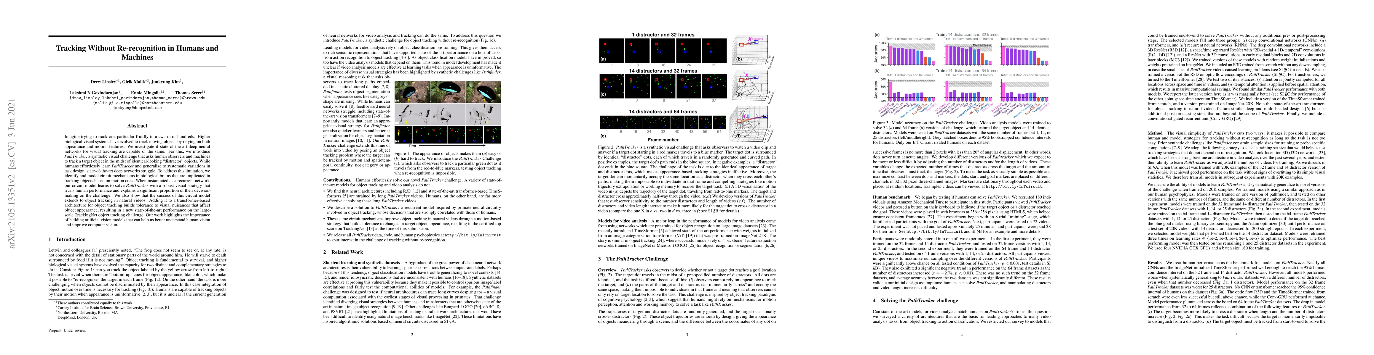 Imagine trying to track one particular fruitfly in a swarm of hundreds. Higher biological visual systems have evolved to track moving objects by relying on both appearance and motion features. We investigate if state-of-the-art deep neural networks for visual tracking are capable of the same. For this, we introduce PathTracker, a synthetic visual challenge that asks human observers and machines to track a target object in the midst of identical-looking "distractor" objects. While humans effortlessly learn PathTracker and generalize to systematic variations in task design, state-of-the-art deep networks struggle. To address this limitation, we identify and model circuit mechanisms in biological brains that are implicated in tracking objects based on motion cues. When instantiated as a recurrent network, our circuit model learns to solve PathTracker with a robust visual strategy that rivals human performance and explains a significant proportion of their decision-making on the challenge. We also show that the success of this circuit model extends to object tracking in natural videos. Adding it to a transformer-based architecture for object tracking builds tolerance to visual nuisances that affect object appearance, resulting in a new state-of-the-art performance on the large-scale TrackingNet object tracking challenge. Our work highlights the importance of building artificial vision models that can help us better understand human vision and improve computer vision.