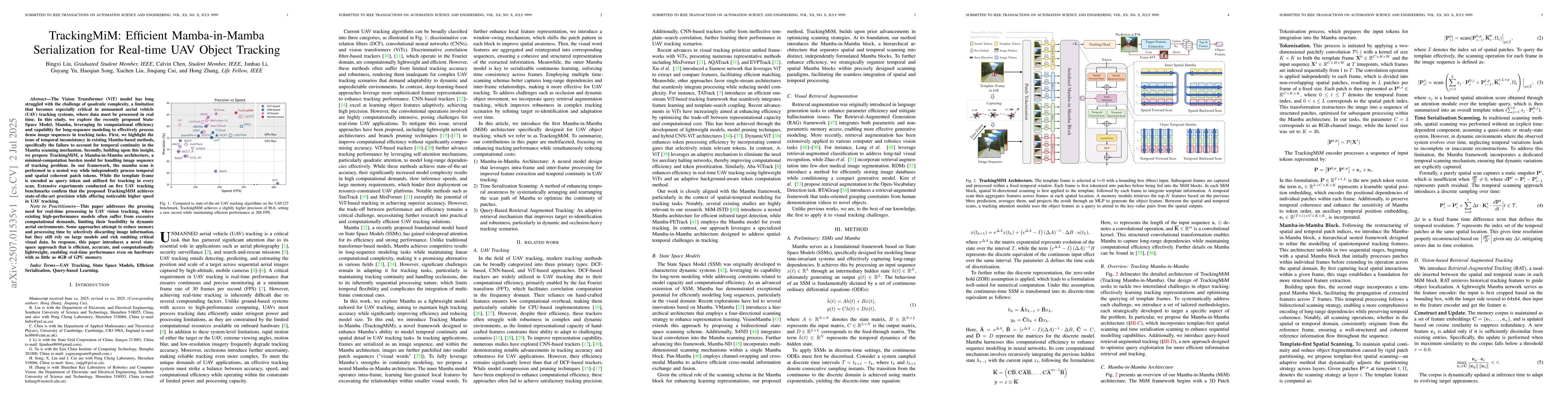 The Vision Transformer (ViT) model has long struggled with the challenge of quadratic complexity, a limitation that becomes especially critical in unmanned aerial vehicle (UAV) tracking systems, where data must be processed in real time. In this study, we explore the recently proposed State-Space Model, Mamba, leveraging its computational efficiency and capability for long-sequence modeling to effectively process dense image sequences in tracking tasks. First, we highlight the issue of temporal inconsistency in existing Mamba-based methods, specifically the failure to account for temporal continuity in the Mamba scanning mechanism. Secondly, building upon this insight,we propose TrackingMiM, a Mamba-in-Mamba architecture, a minimal-computation burden model for handling image sequence of tracking problem. In our framework, the mamba scan is performed in a nested way while independently process temporal and spatial coherent patch tokens. While the template frame is encoded as query token and utilized for tracking in every scan. Extensive experiments conducted on five UAV tracking benchmarks confirm that the proposed TrackingMiM achieves state-of-the-art precision while offering noticeable higher speed in UAV tracking.